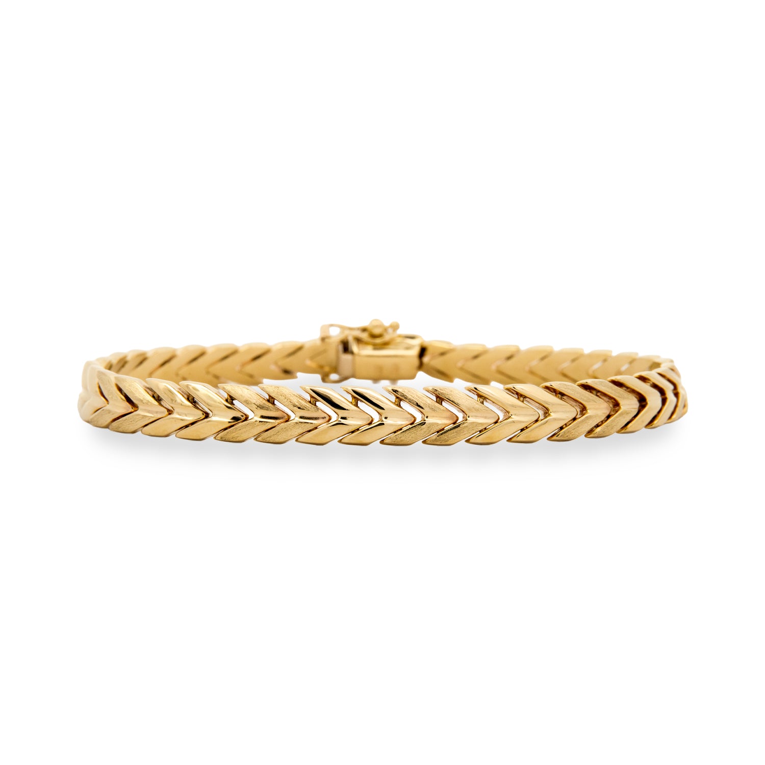 7.25" 14 karat yellow gold estate 6.3 mm fancy link bracelet, equipped with a box clasp and two figure eight safety mechanisms.Details