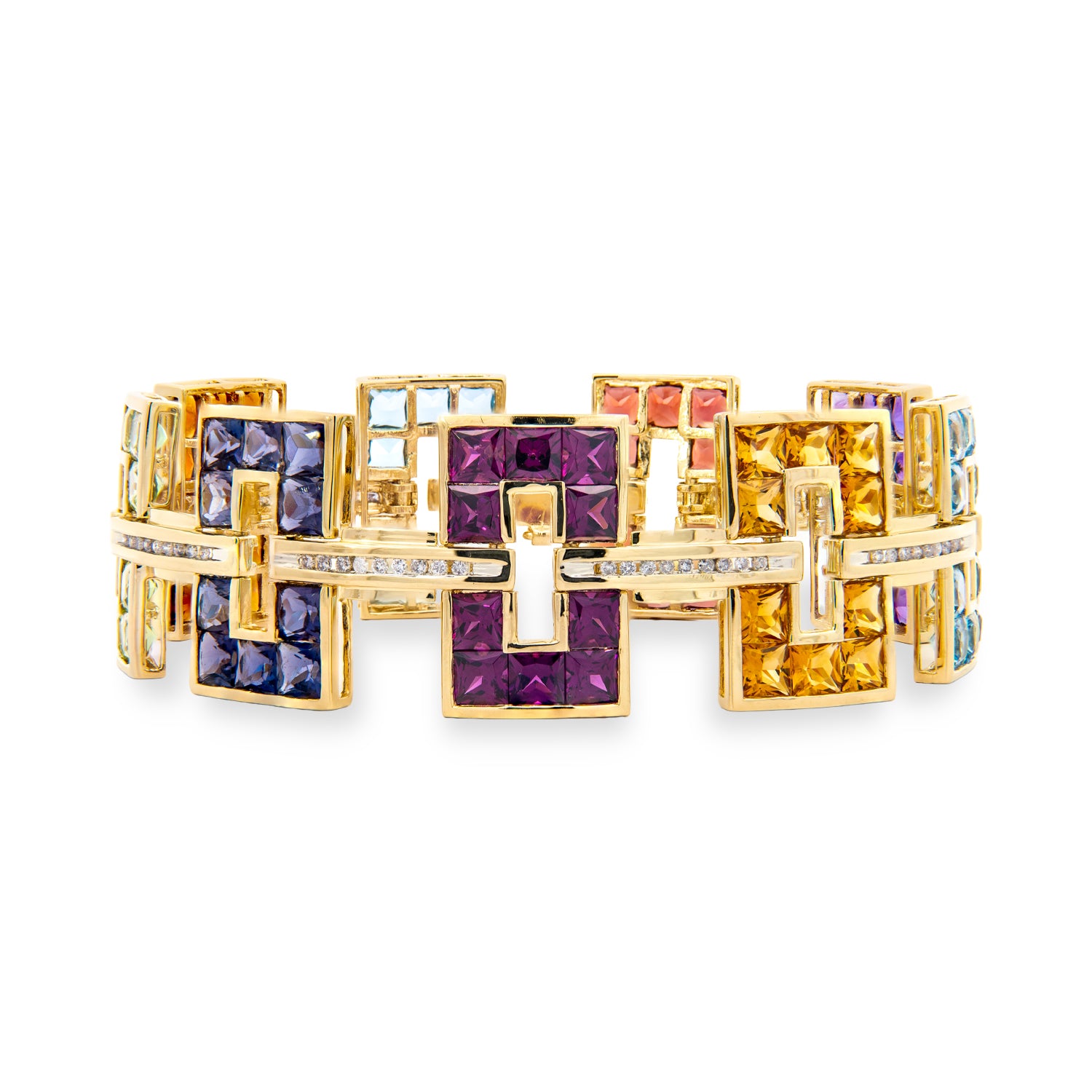 7.5" 14 karat yellow gold estate link bracelet set with 10/4 mm princess cut garnets, 10/4 mm princess cut amethysts, 10/4 mm princess cut Swiss blue topaz, 10/4 mm princess cut citrine, 10/4 mm princess cut rhodolite garnets, 10/4 mm princess cut iolites, 10/4 mm princess cut peridots, 10/4 mm princess cut madiera citrines, 10/4 mm princess cut London blue topaz, accented with 81 channel set round brilliant cut diamonds at 0.81 carat total weight with G - H - I color and I1 clarity, equipped with a folder over clasp, and figure eight style safety mechanism.Details