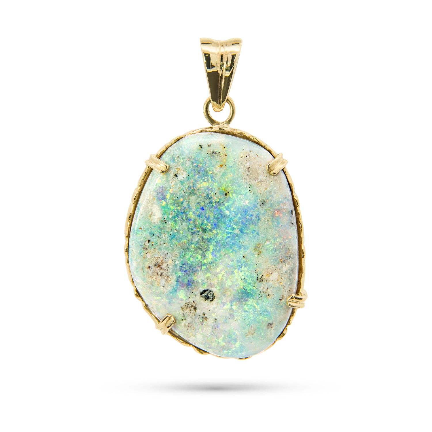 This 14K yellow gold estate pendant features an oval grey-base opal displaying a soft play of color with flashes of green and blue, accented by subtle hints of red and orange that appear as the light shifts. Natural inclusions and tonal variations give the opal depth and individuality, highlighting its organic beauty. The stone is secured in a prong-style setting with a gently textured yellow gold border and finished with a polished yellow gold bail.