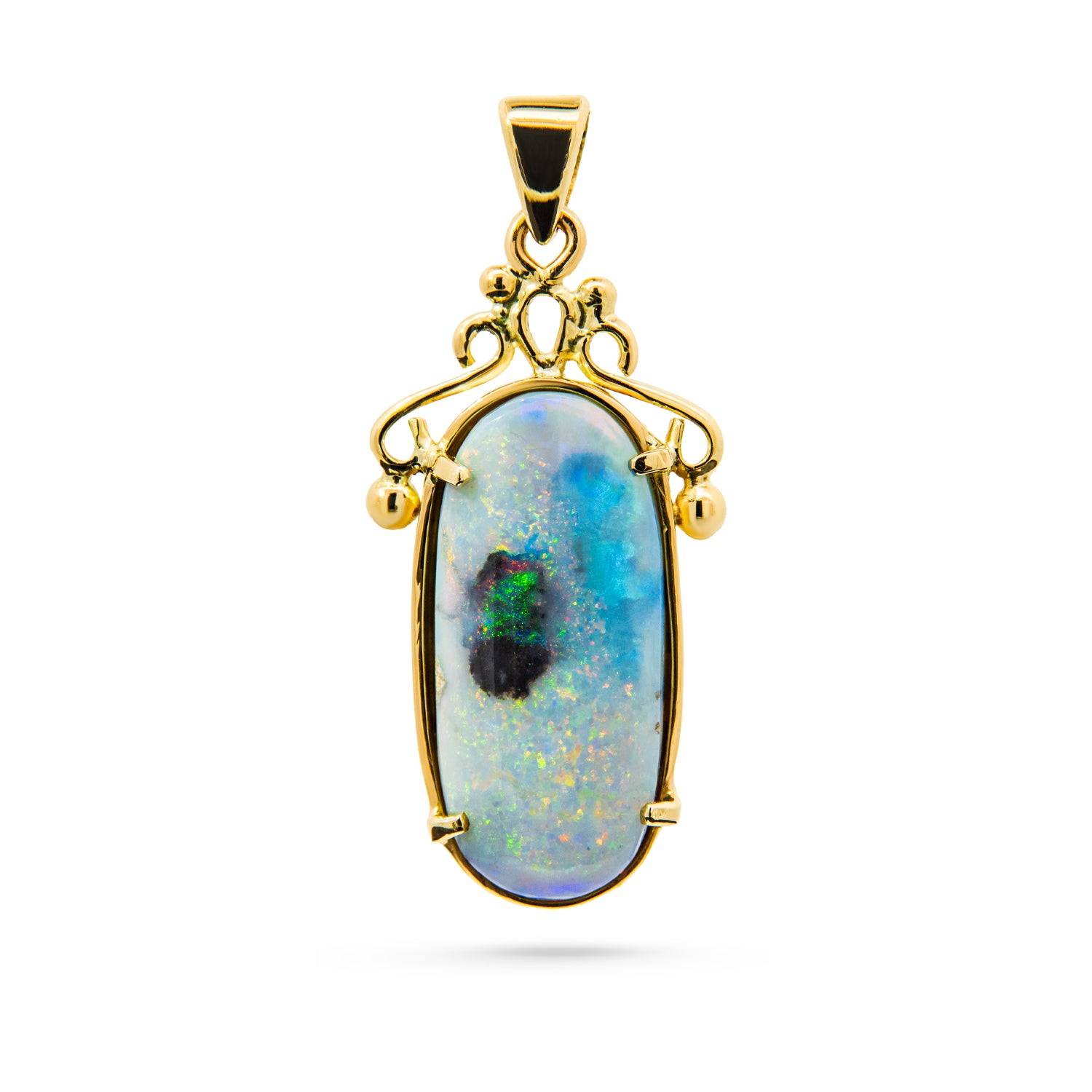 This 14K yellow gold estate pendant features an oval grey-base opal displaying a soft, luminous play of color. Flashes of green and blue move across the surface, with subtle red and orange tones appearing as the pendant catches the light. Natural inclusions and tonal variations contribute to the opal’s depth and organic character, making each viewing angle slightly different. The opal is secured in a classic prong setting framed by a smooth yellow gold bezel edge, complemented by decorative gold detailing at the bail. Finished with a polished yellow gold bail, this estate pendant highlights the natural beauty and individuality of the opal.Details