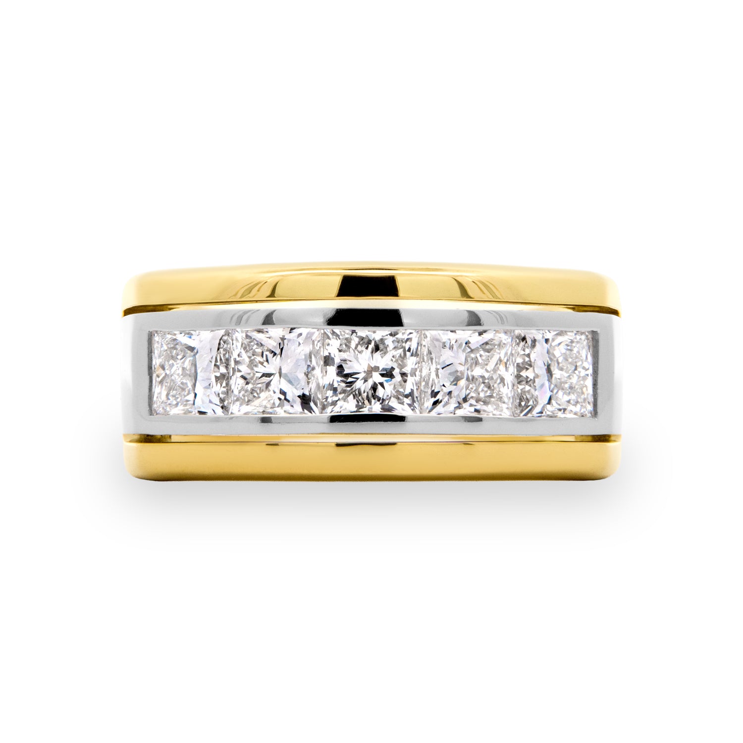 18 karat yellow gold and platinum Bensel Made men's five stone band channel set with five princess cut lab grown diamonds at 2.92 carat total weight with E - F color and VS1 - VS2 clarity.Details