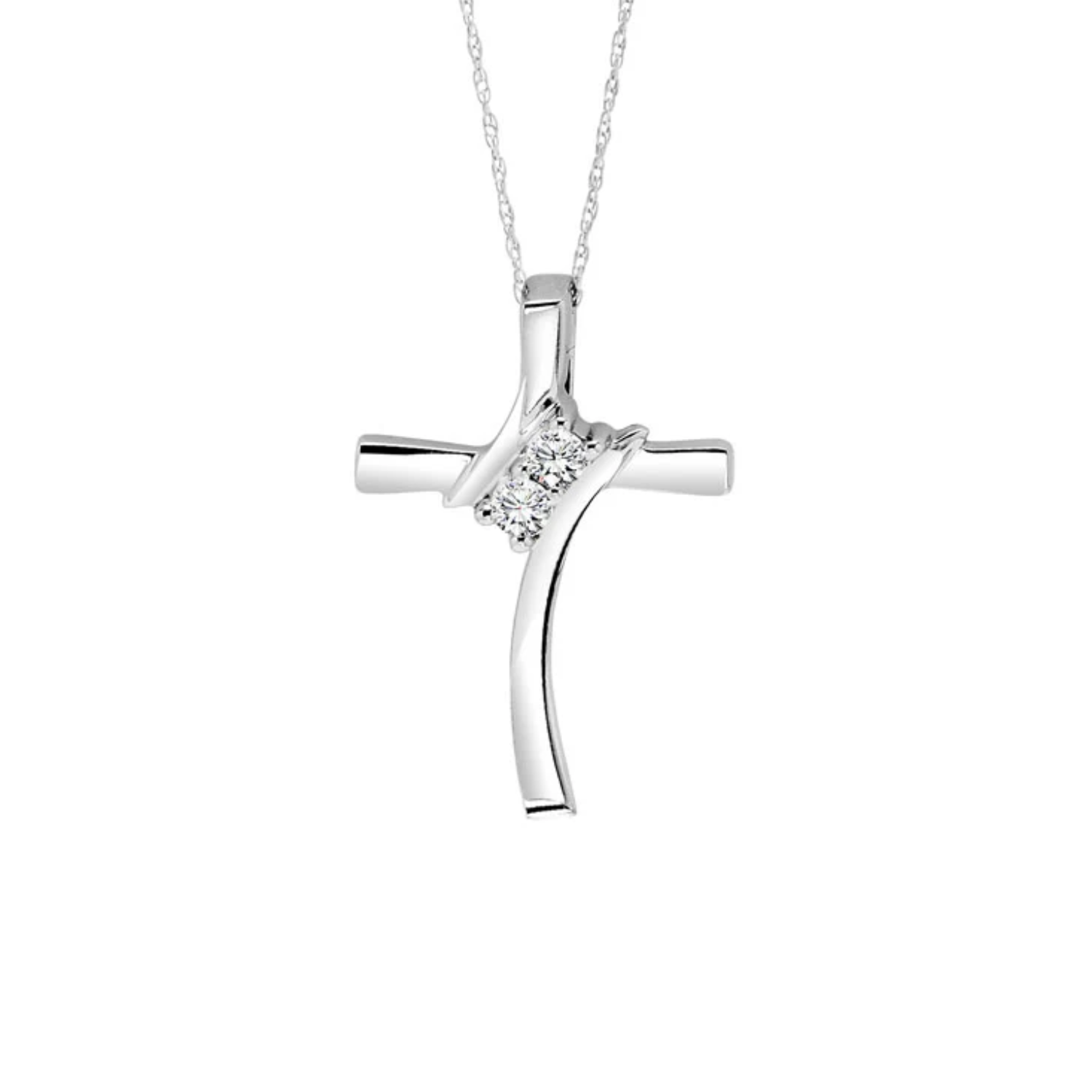 Celebrate your faith with this elegant sterling silver cross pendant, adorned with two sparkling diamonds. This beautifully crafted piece features a modern, flowing cross design that exudes both simplicity and sophistication. The two diamonds are gracefully set at the center, adding a touch of brilliance to this timeless symbol. Perfect for everyday wear or special occasions, this sterling silver cross pendant is a meaningful addition to any jewelry collection.Details