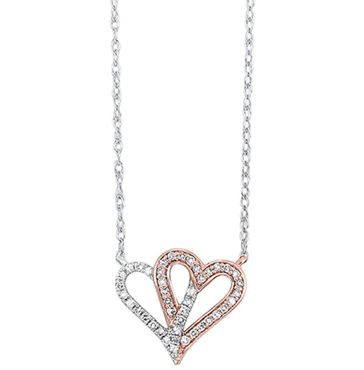 This 10K white and rose gold necklace features a graceful double heart design, accented with shimmering diamonds throughout. The intertwining hearts symbolize unity and love, with the contrast of metals adding a meaningful touch. A charming piece for everyday wear or a heartfelt gift.Details