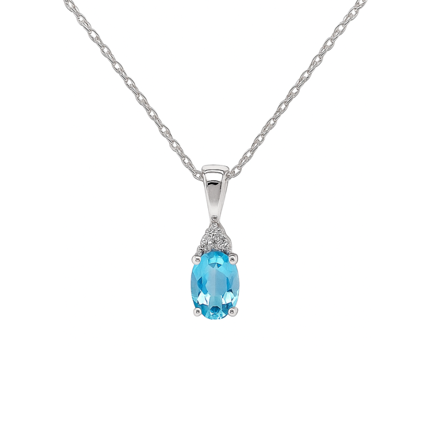 This 10K white gold pendant showcases a vibrant Swiss blue topaz, elegantly accented by a trio of round brilliant cut diamonds. Suspended from a 10K white gold chain, the oval blue topaz adds a refreshing pop of color, making it an ideal piece for both everyday elegance and special occasions.Details