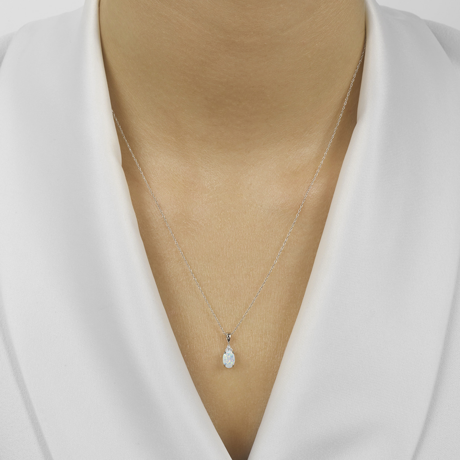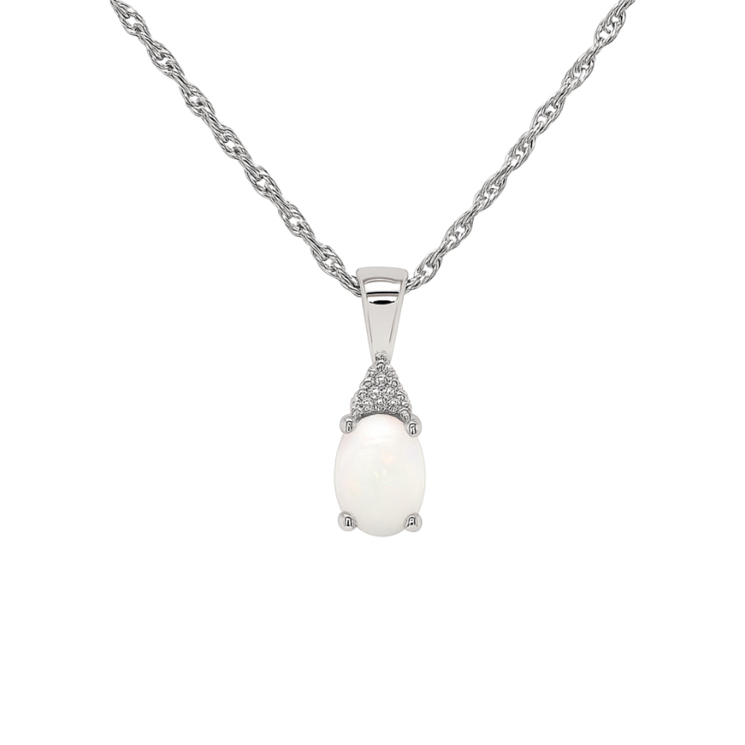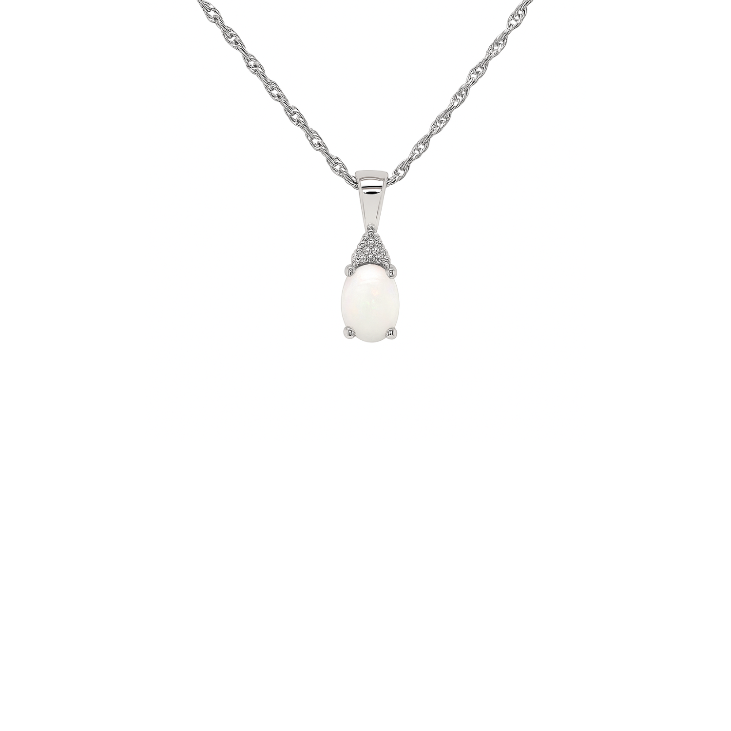 This 10K white gold pendant features an oval opal with a mesmerizing play of color. Accented by a trio of brilliant diamonds, the design enhances the opal’s natural iridescence. Suspended from a matching 10K white gold chain, this pendant is an elegant and timeless addition to any jewelry collection.Details
