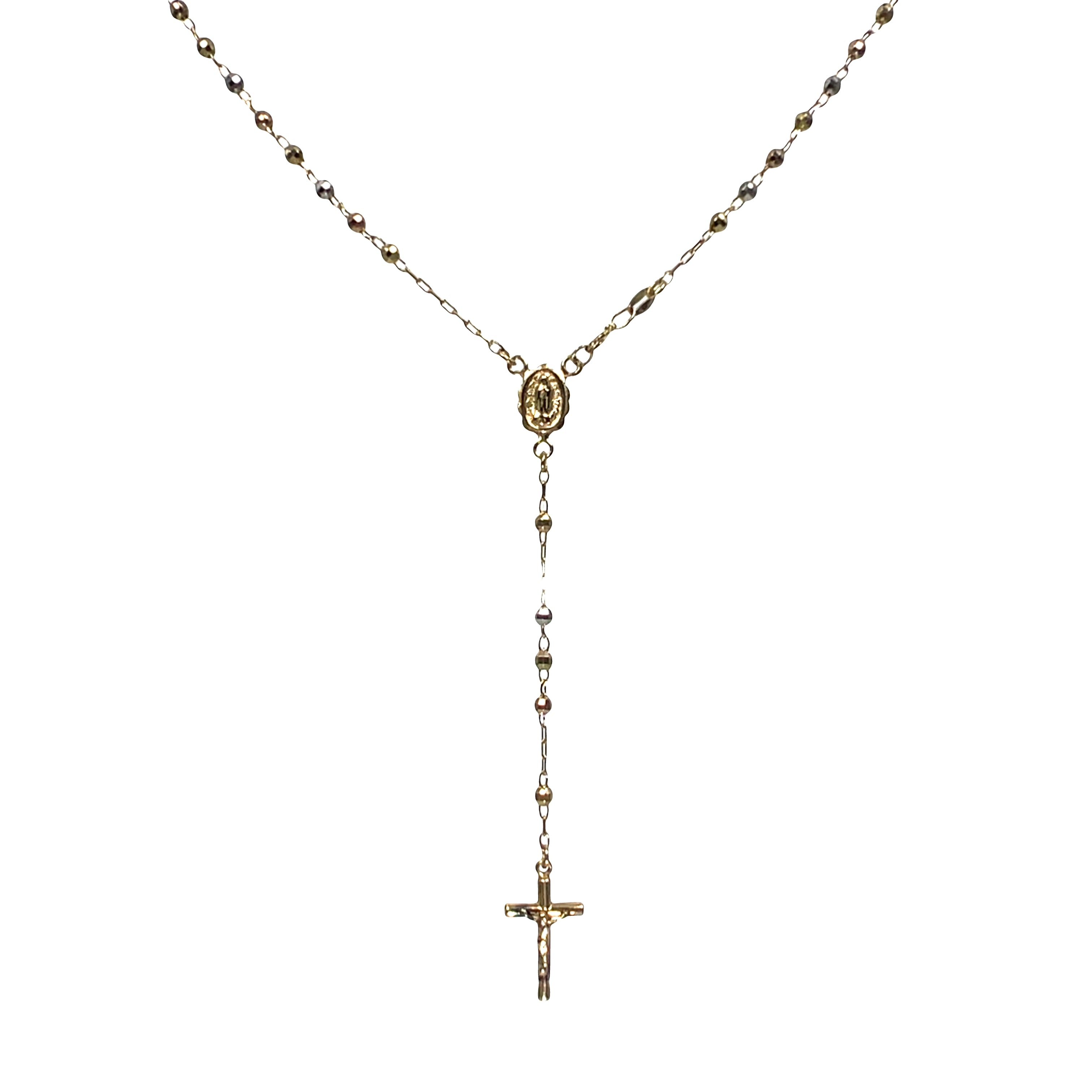 This estate rosary necklace is beautifully crafted in 14K yellow, rose, and white gold, blending warm and cool tones for a distinctive look. Featuring intricate beading, a central medallion, and a finely detailed crucifix, it’s a meaningful piece that combines faith and craftsmanship in a timeless design.Details