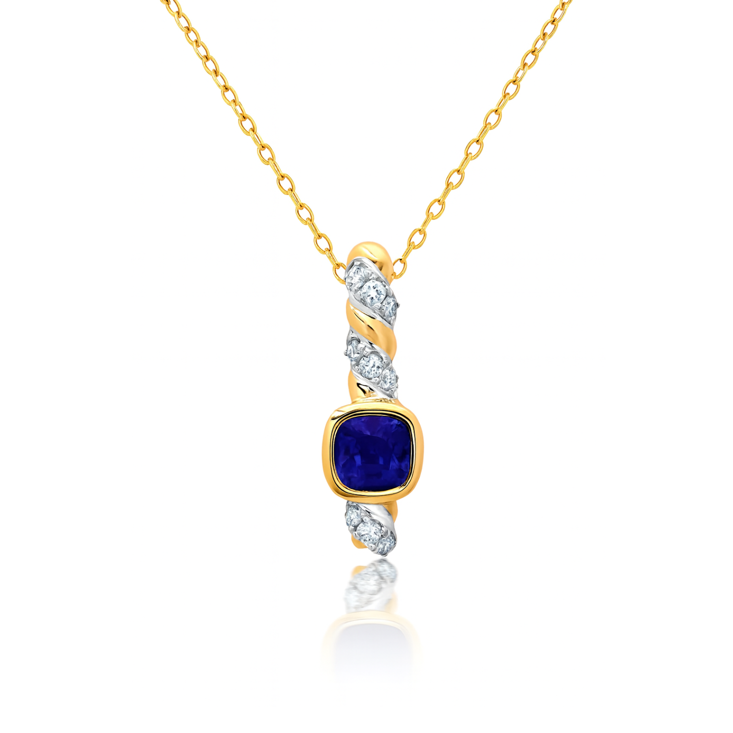 14 karat two tone yellow and white gold bar style pendant bezel set with one 5 mm century cushion Chatham lab grown blue sapphire at 0.90 carat, accented with nine round brilliant cut lab grown diamonds at 0.14 carat total weight with E - F color and VS1 - VS2 clarity. This pendant is hung on an 18" adjustable 14 karat yellow gold 0.9 mm cable chain, equipped with a lobster claw style clasp. This chain has adjustments at 16" and 17".Details