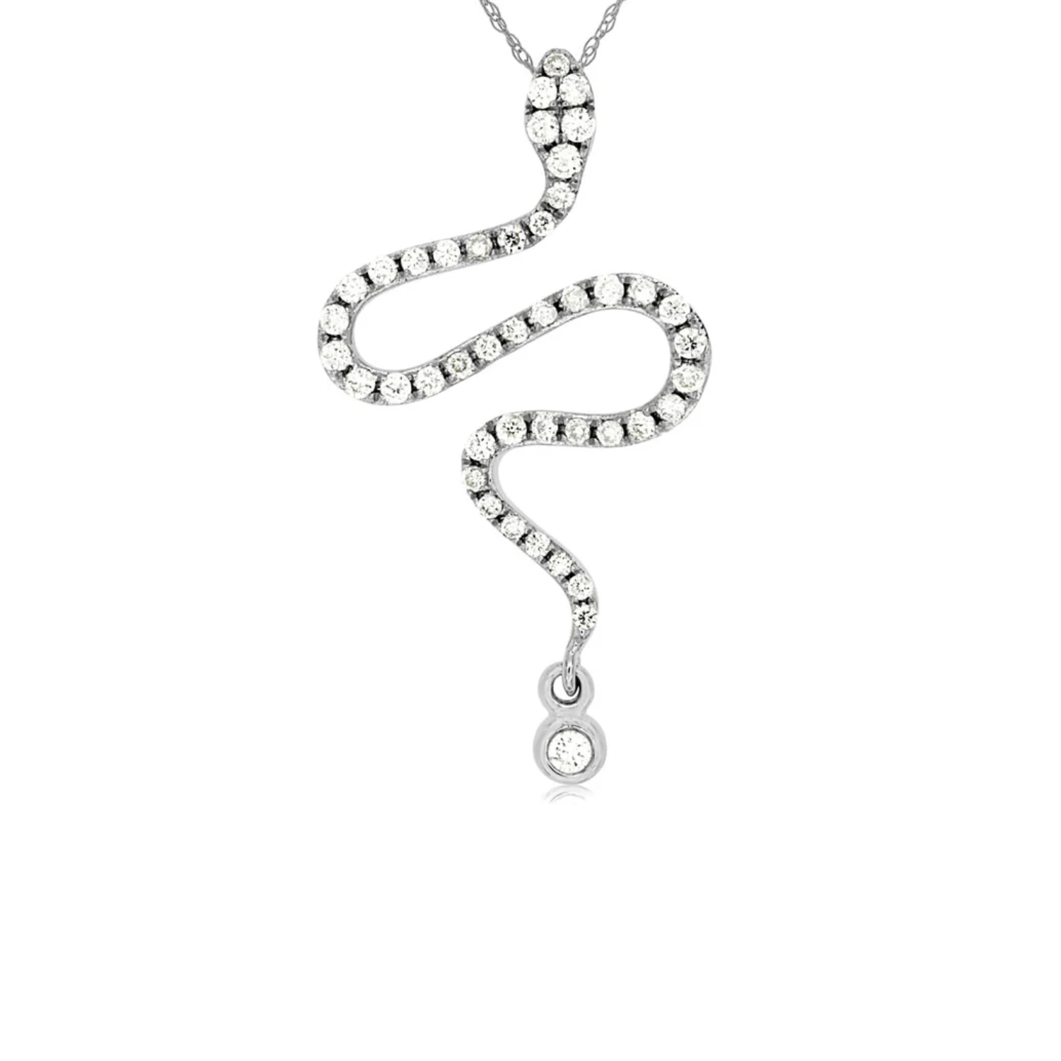This elegant 14K white gold necklace showcases a diamond-encrusted snake pendant. The serpentine design sparkles with round brilliant cut diamonds along its sinuous body, culminating in a single dangling diamond at the tail. Suspended from a delicate chain, this piece offers a captivating blend of symbolism and luxury, perfect for making a sophisticated statement.Details