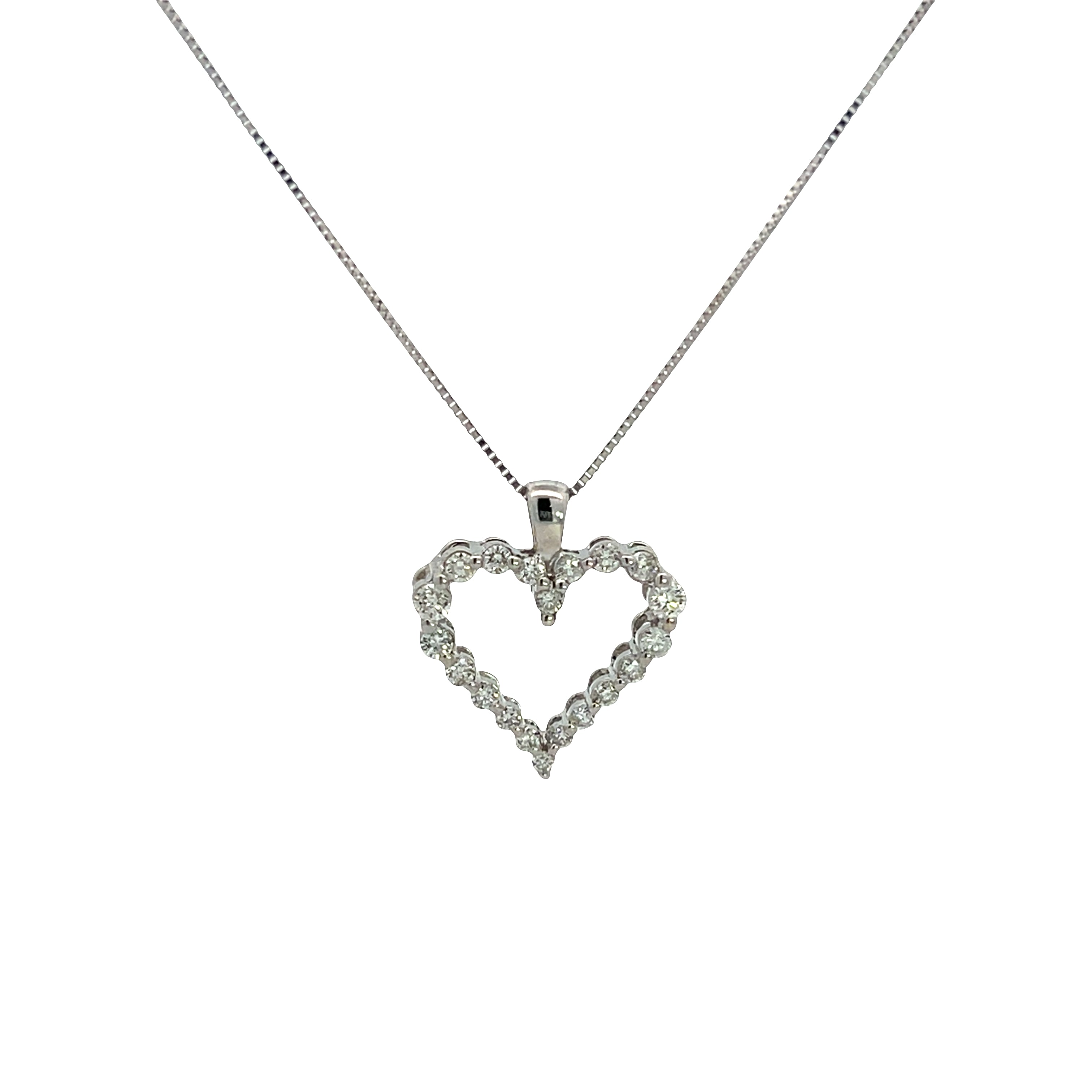 This estate necklace features a heart-shaped pendant crafted in 14K white gold, adorned with round brilliant cut diamonds that create a graceful open-heart silhouette. Suspended from a delicate chain, it’s a romantic and timeless piece that adds a touch of sparkle to any look.Details