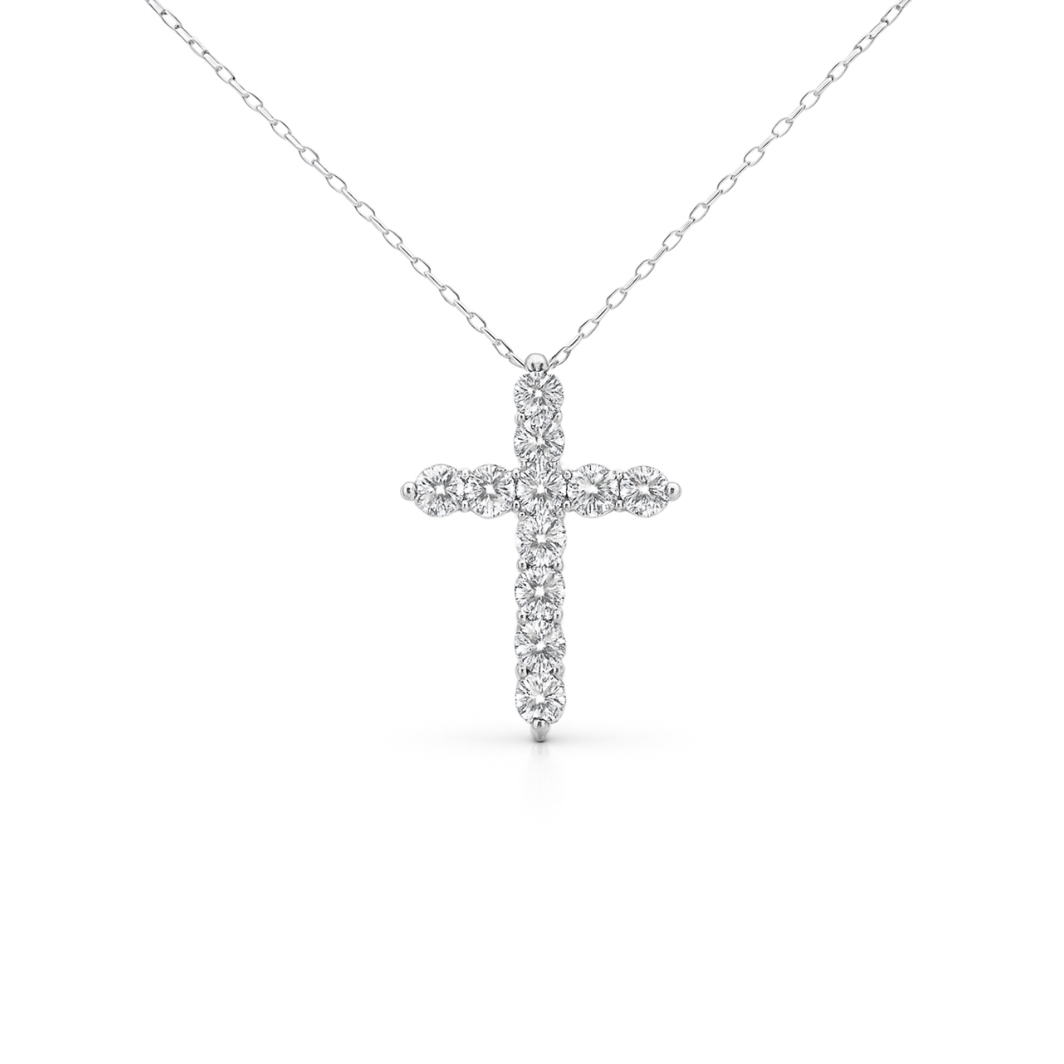 14 karat white gold cross pendant set with 11 round brilliant cut lab grown diamonds at 1/2 carat total weight with E - F color and VS1 - VS2 clarity. This pendant is hung on an 18" 14 karat white gold 0.8 mm pendant cable chain, equipped with a spring ring style clasp.Details