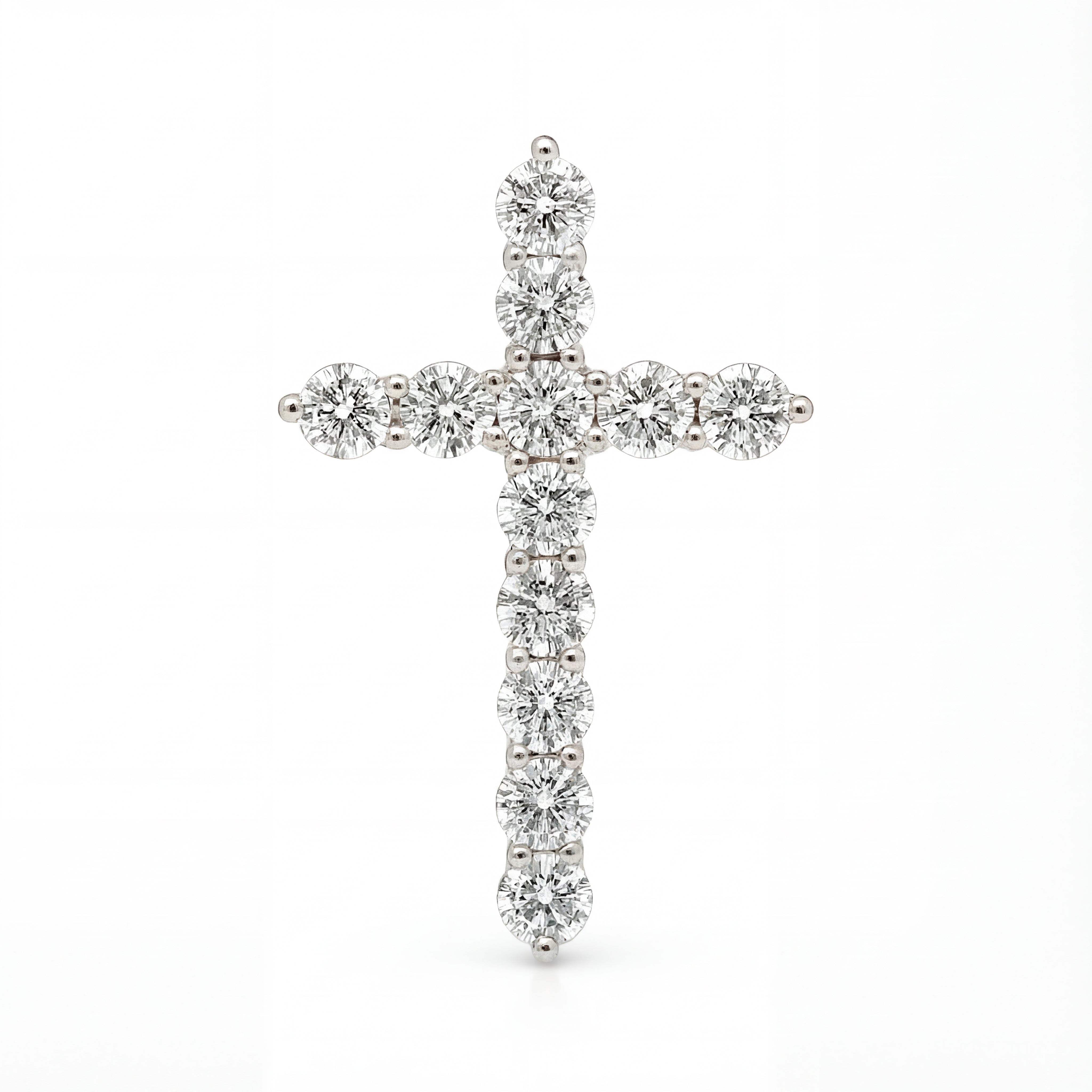 14 karat white gold cross pendant set with 11 round brilliant cut lab grown diamonds at 1 carat total weight with E - F color and VS1 - VS2 clarity.Details