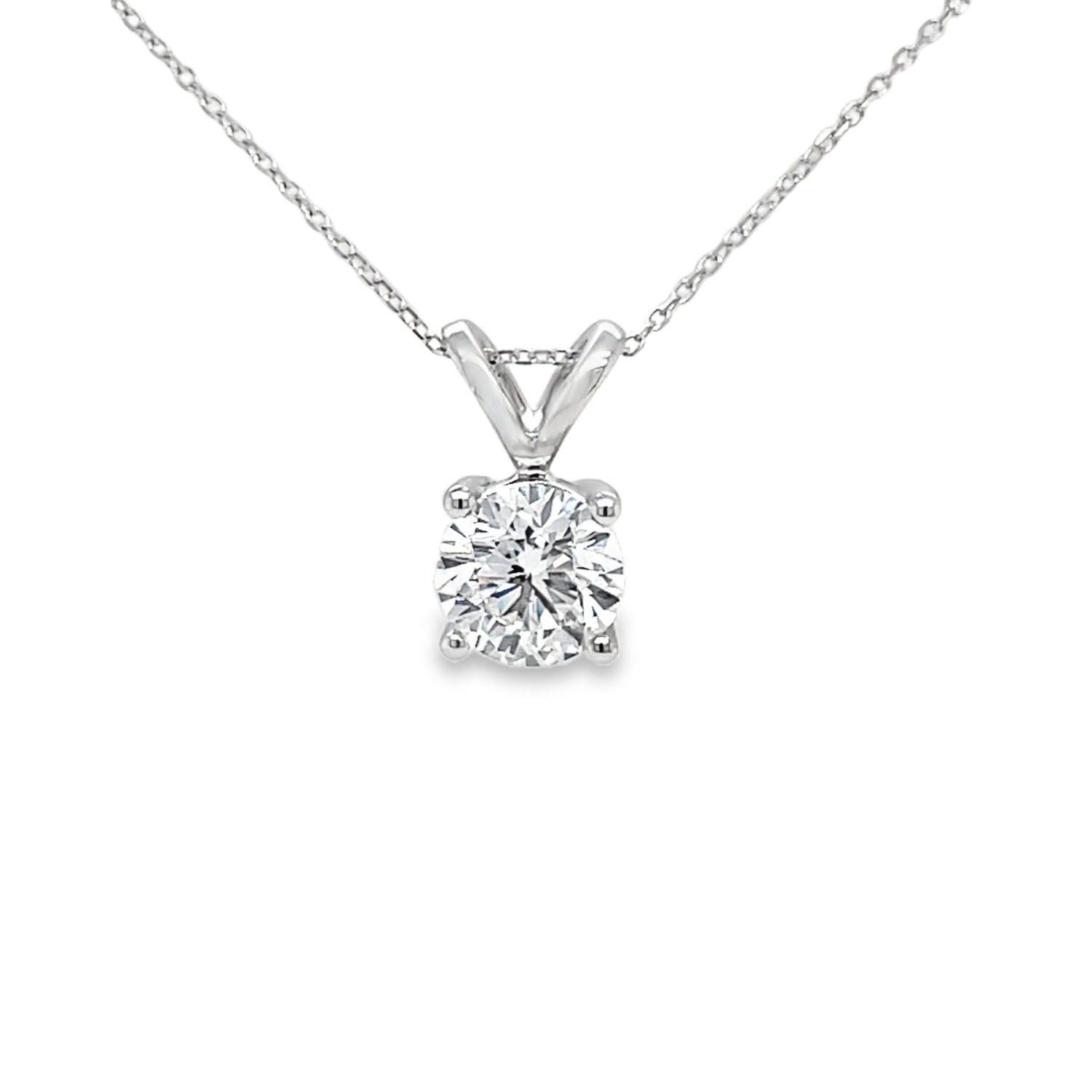 Crafted in 14K white gold, this timeless pendant showcases a round brilliant cut lab grown diamond set in a classic four-prong setting. Suspended from a delicate 14K white gold chain, this piece offers understated elegance, making it a perfect choice for both everyday wear and special occasions.Details