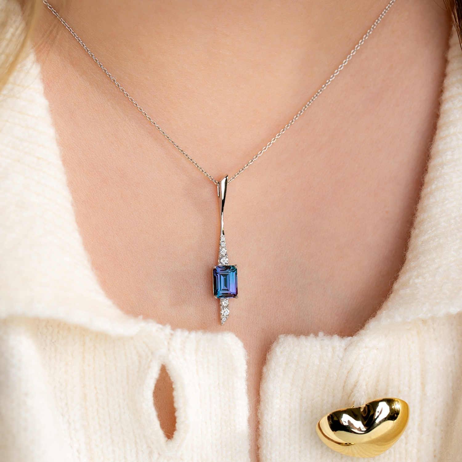 14 karat white gold drop pendant set with one 8 x 6 mm emerald cut Chatham lab grown alexandrite at 1.70 carat, accented with seven round brilliant cut lab grown diamonds at 0.19 carat total weight with E - F color and VS1 - VS2 clarity. This pendant is hung on an 18" adjustable 14 karat white gold 0.9 mm cable chain, equipped with a lobster claw style clasp. This chain has adjustments at 16" and 17".Details