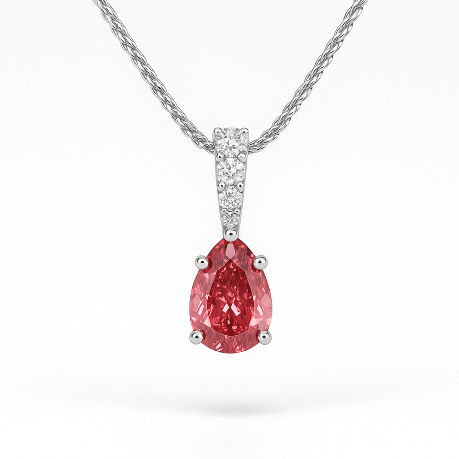 14 karat white gold accented pendant set with one 1.02 carat pear shaped lab grown fancy vivid purplish red diamond with VS2 clarity, accented with four round brilliant cut lab grown diamonds at 0.09 carat total weight with E - F color and VS1 - VS2 clarity.Details