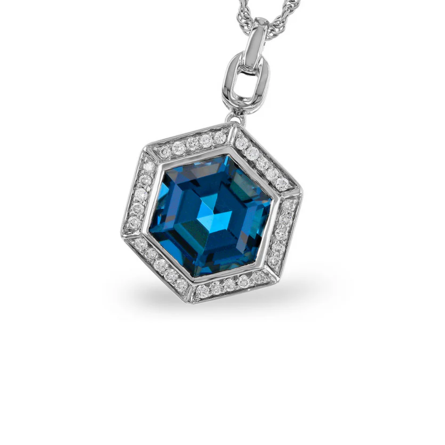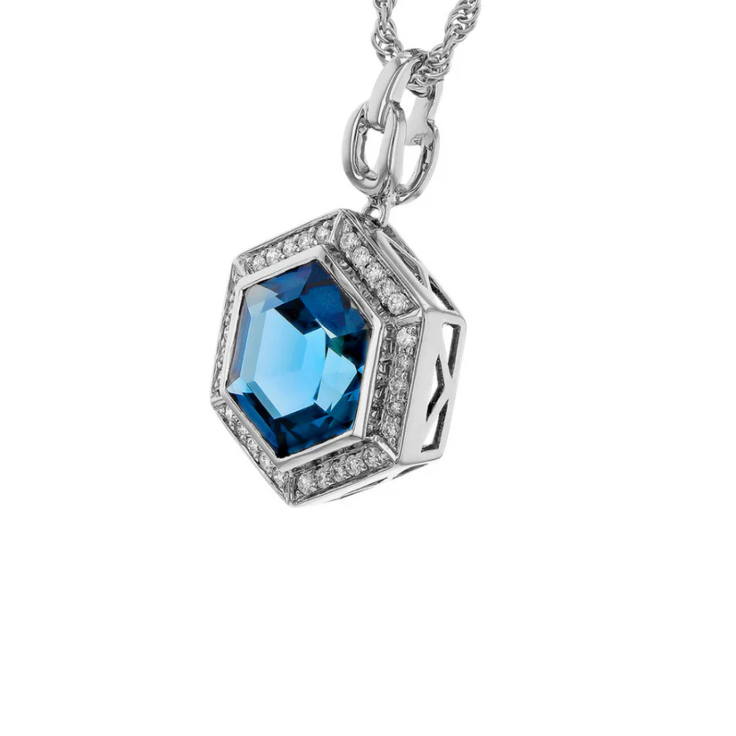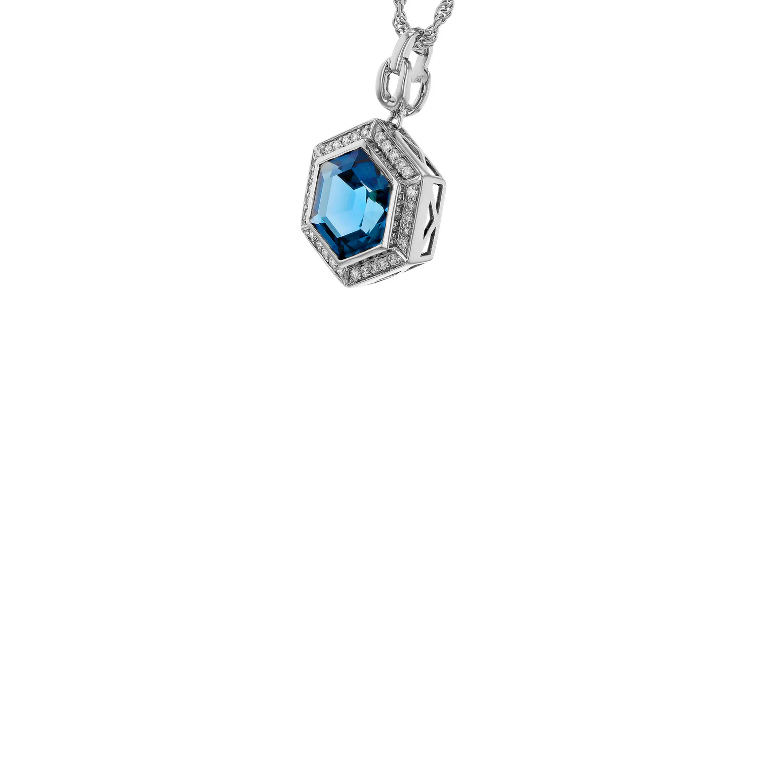 This 14K white gold pendant features a striking hexagon cut London blue topaz, set at the center of a geometric frame. A halo of round brilliant cut diamonds enhances the shape and adds extra brilliance to the design. The pendant is paired with an 18 inch 14K white gold chain secured by a lobster clasp, offering a bold yet refined look.Details