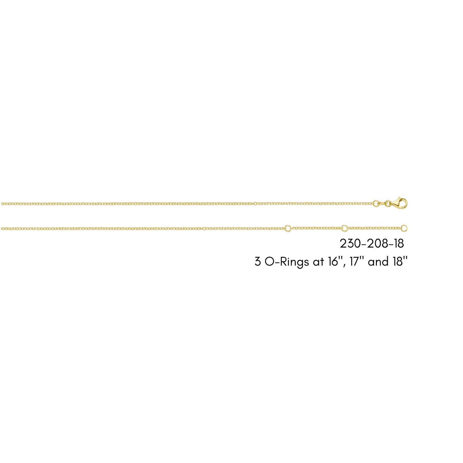 18" adjustable 14 karat yellow gold 1.3 mm D/C cable chain, with adjustments at 16" and 17", equipped with a lobster claw style clasp.Details