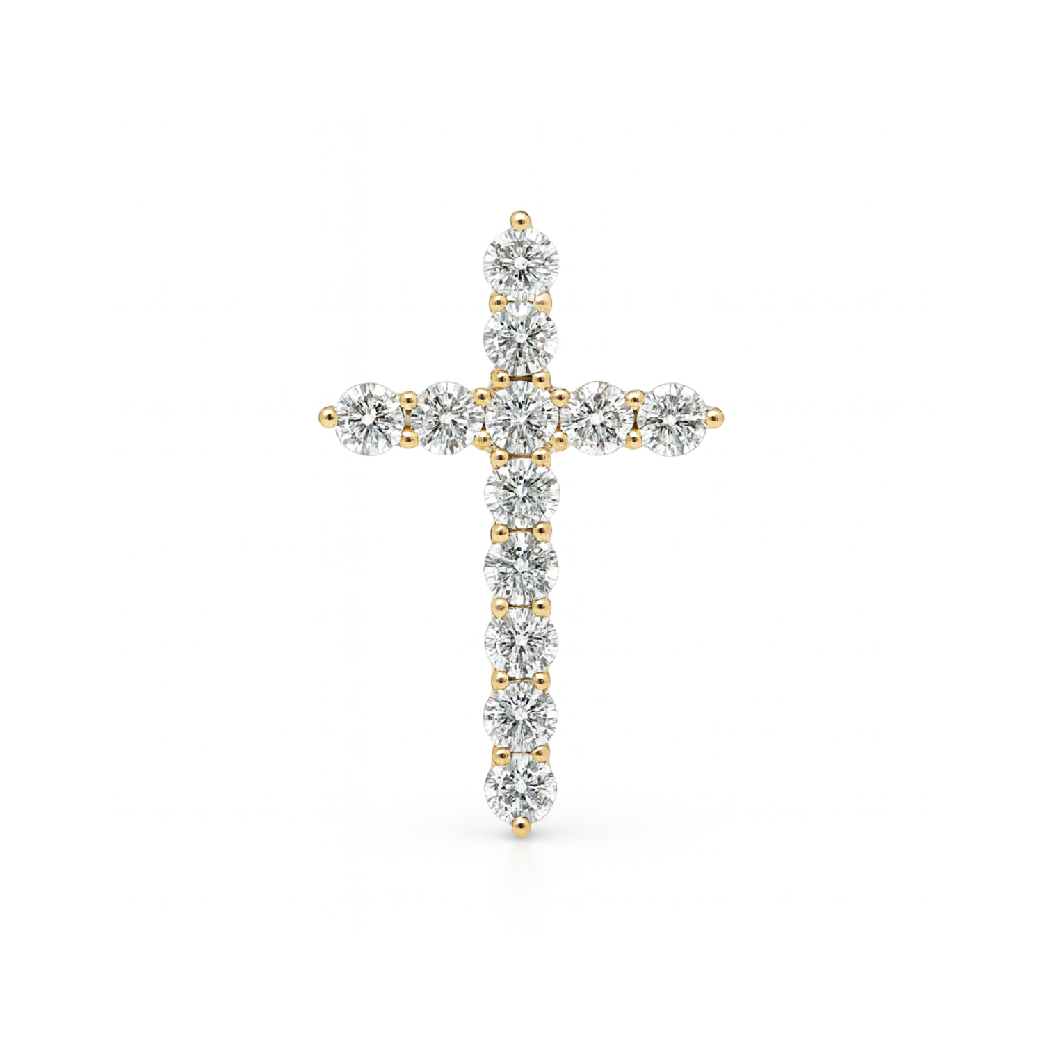 14 karat yellow gold cross pendant set with 11 round brilliant cut lab grown diamonds at 1 carat total weight with E - F color and VS1 - VS2 clarity.Details