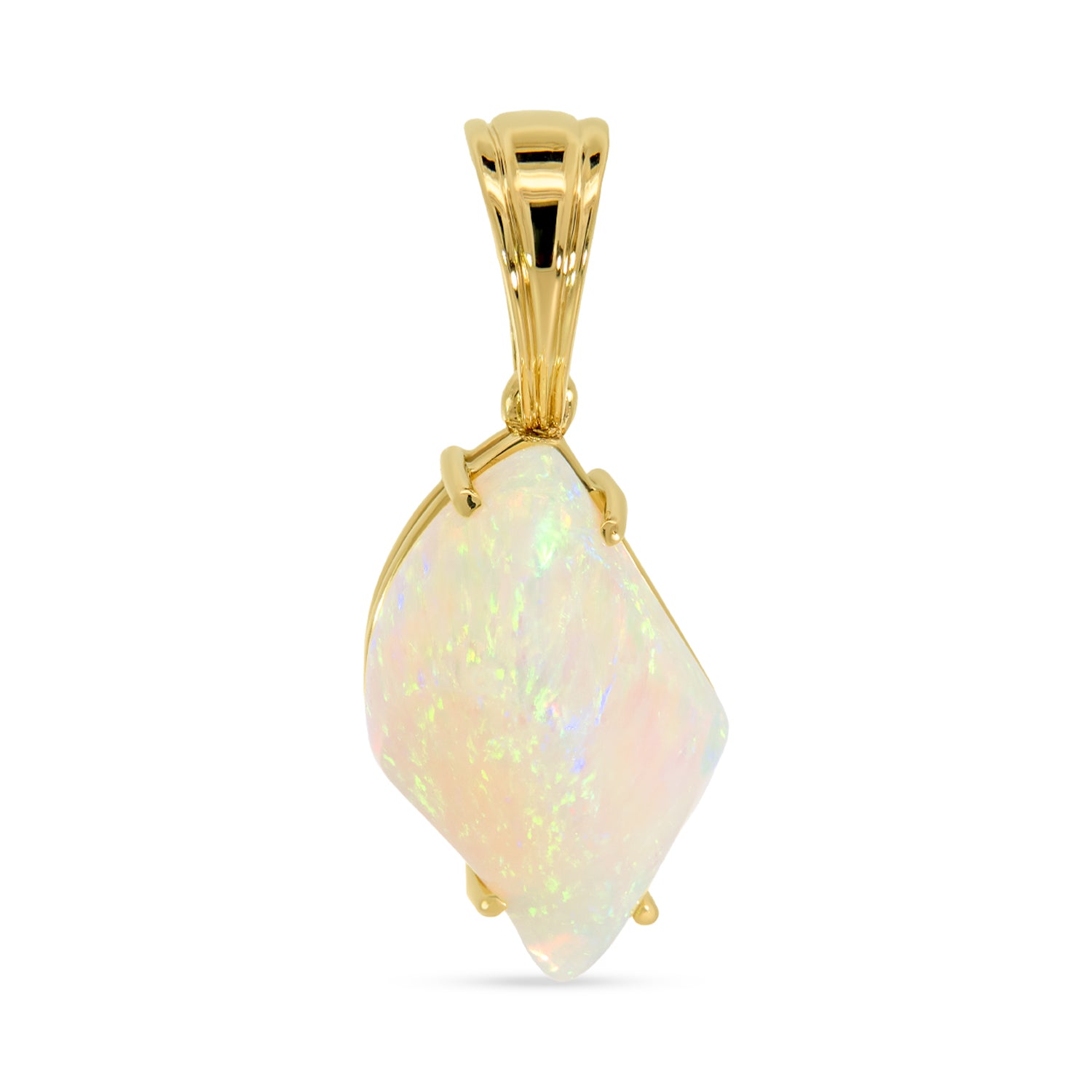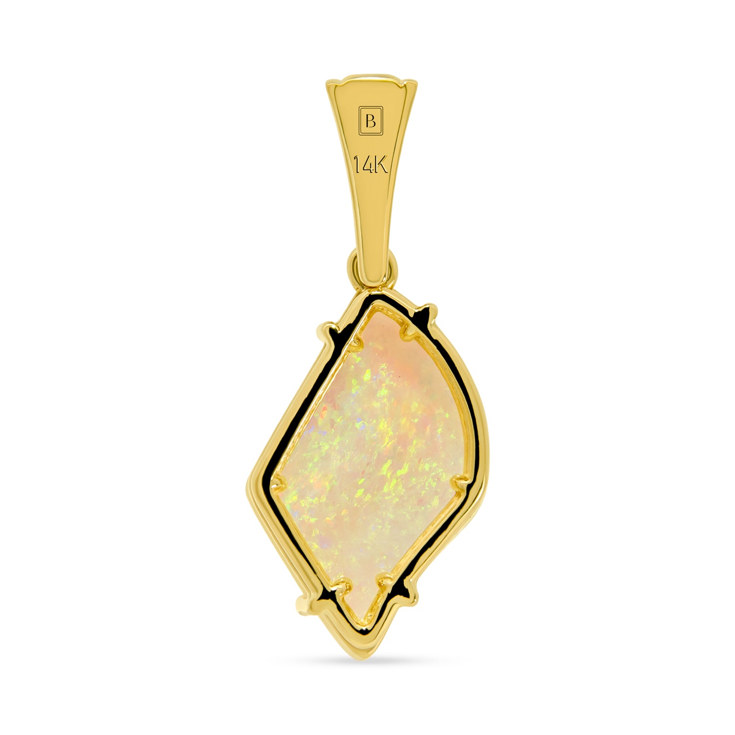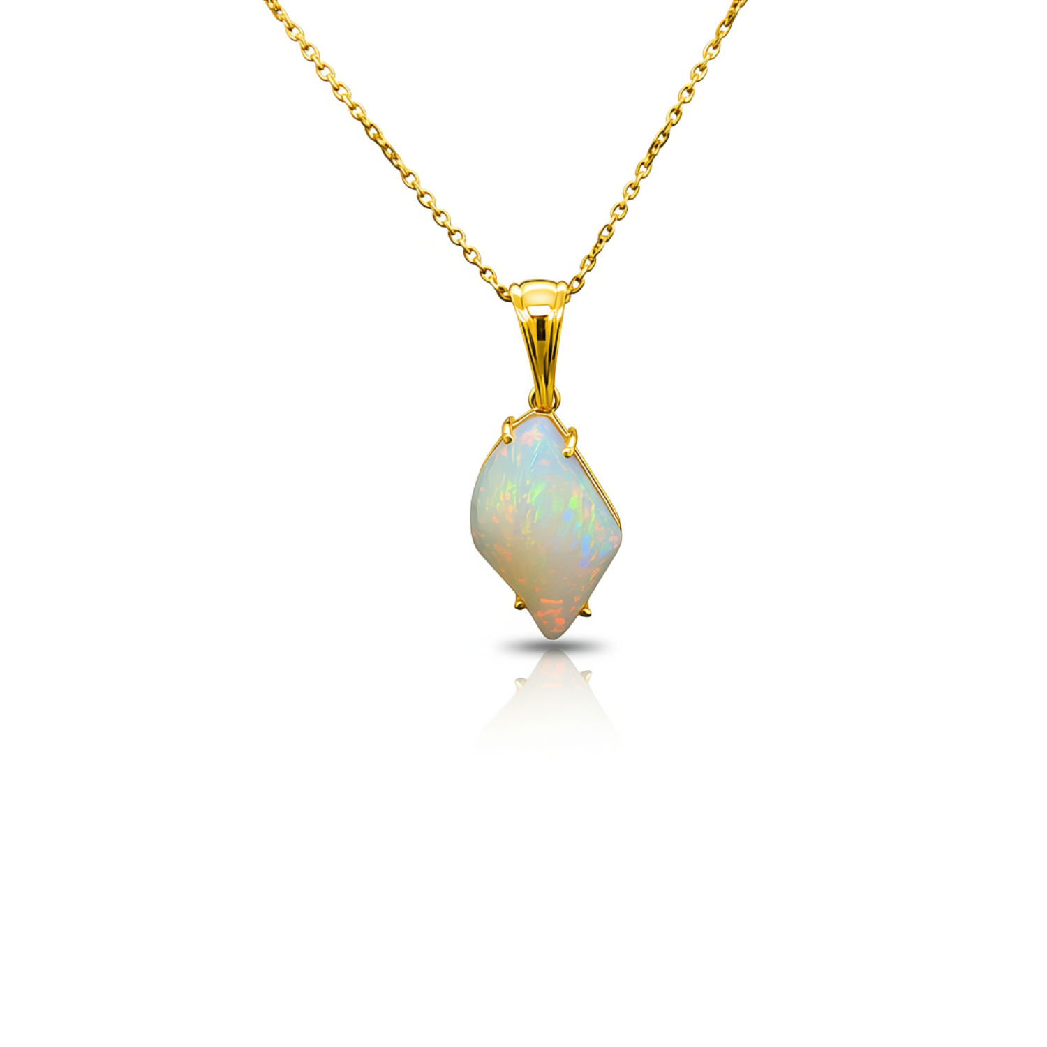 This 14K yellow gold Bensel Made pendant features a freeform cabochon-cut crystal base opal, held in an elegant prong setting that highlights the stone’s vivid play of color with flashes of green, orange, and blue. The pendant is suspended from a matching 14K yellow gold chain equipped with a secure lobster claw clasp, completing the look with refined continuity and lasting craftsmanship.
