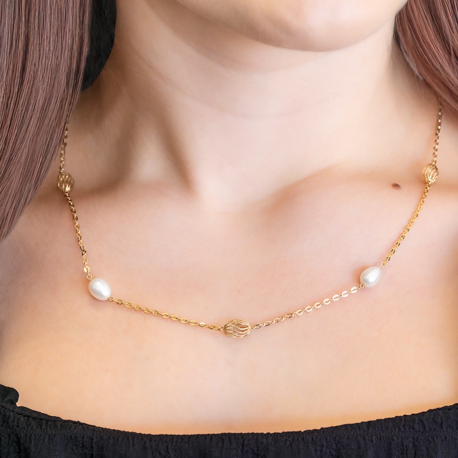 This 14K yellow gold station necklace features cultured freshwater pearls alternating with textured gold beads along a delicate chain. The evenly spaced pearls and decorative gold elements create visual interest while maintaining an elegant, understated design. This necklace is a versatile and refined piece that transitions effortlessly from day to evening wear.Details