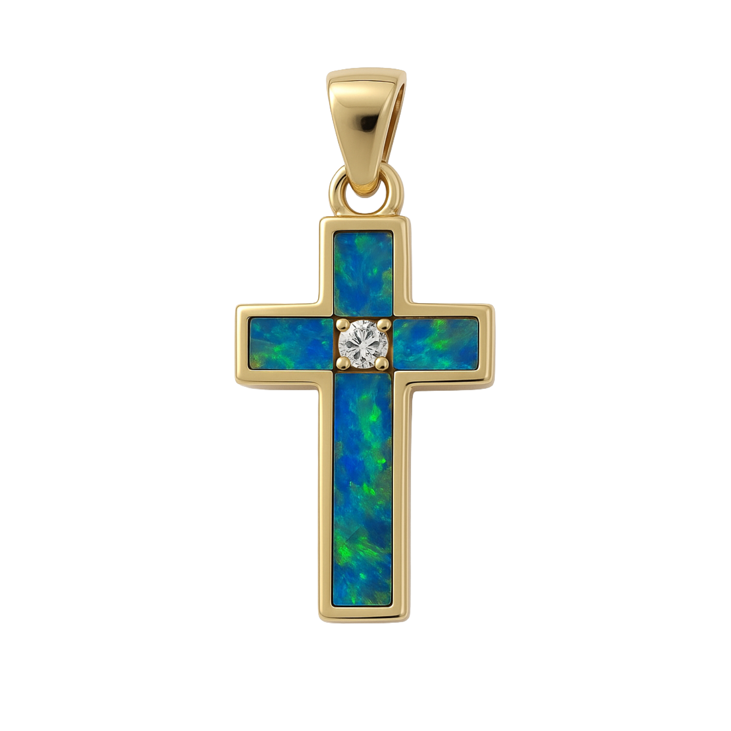 This 14K yellow gold cross pendant features vibrant opal doublet inlay along each arm, enhanced at the center with a round brilliant cut diamond. Its rich color and refined detailing create a meaningful piece with a striking, luminous look.Details