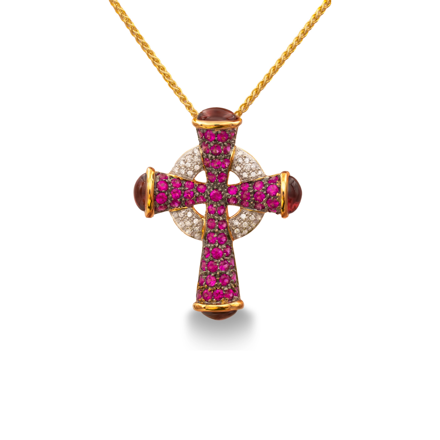 This exquisite estate 14K yellow gold cross pendant is adorned with vibrant rubies, shimmering diamonds, and accented by pink tourmaline cabochons, creating a captivating contrast. The rich red rubies, beautifully complemented by the sparkling diamonds, highlight the intricate design, while the pink tourmaline adds a touch of softness and elegance. A meaningful and luxurious pendant that adds a bold statement to any jewelry collection.Details