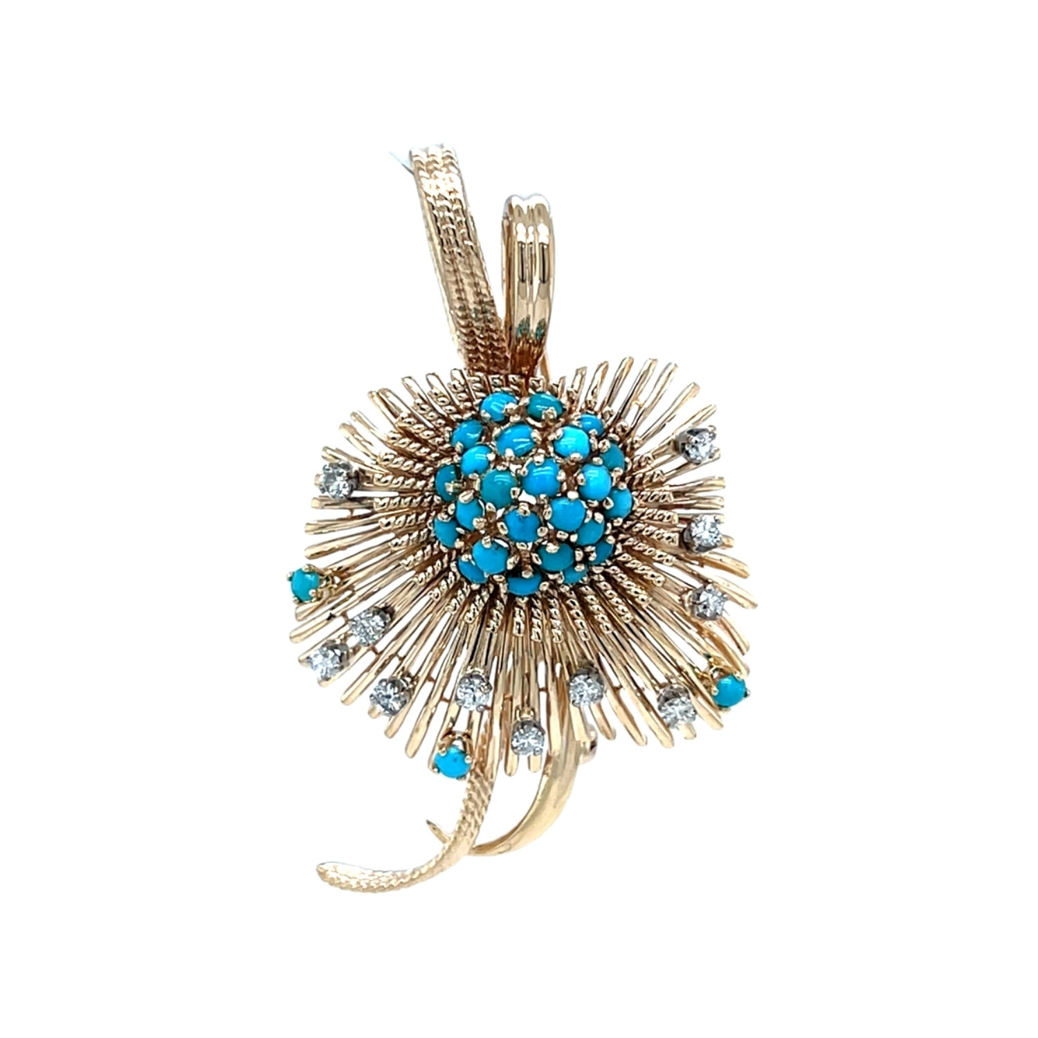 This 14K yellow gold estate pendant boasts a vibrant cluster of bright blue turquoise stones at its center, surrounded by an intricate sunburst design. Radiating outward from the turquoise, a series of delicate gold spikes are beautifully accented by sparkling diamonds, creating an eye-catching blend of colors and textures. This pendant is perfect for those who appreciate unique, retro-style estate jewelry with a pop of color.Details