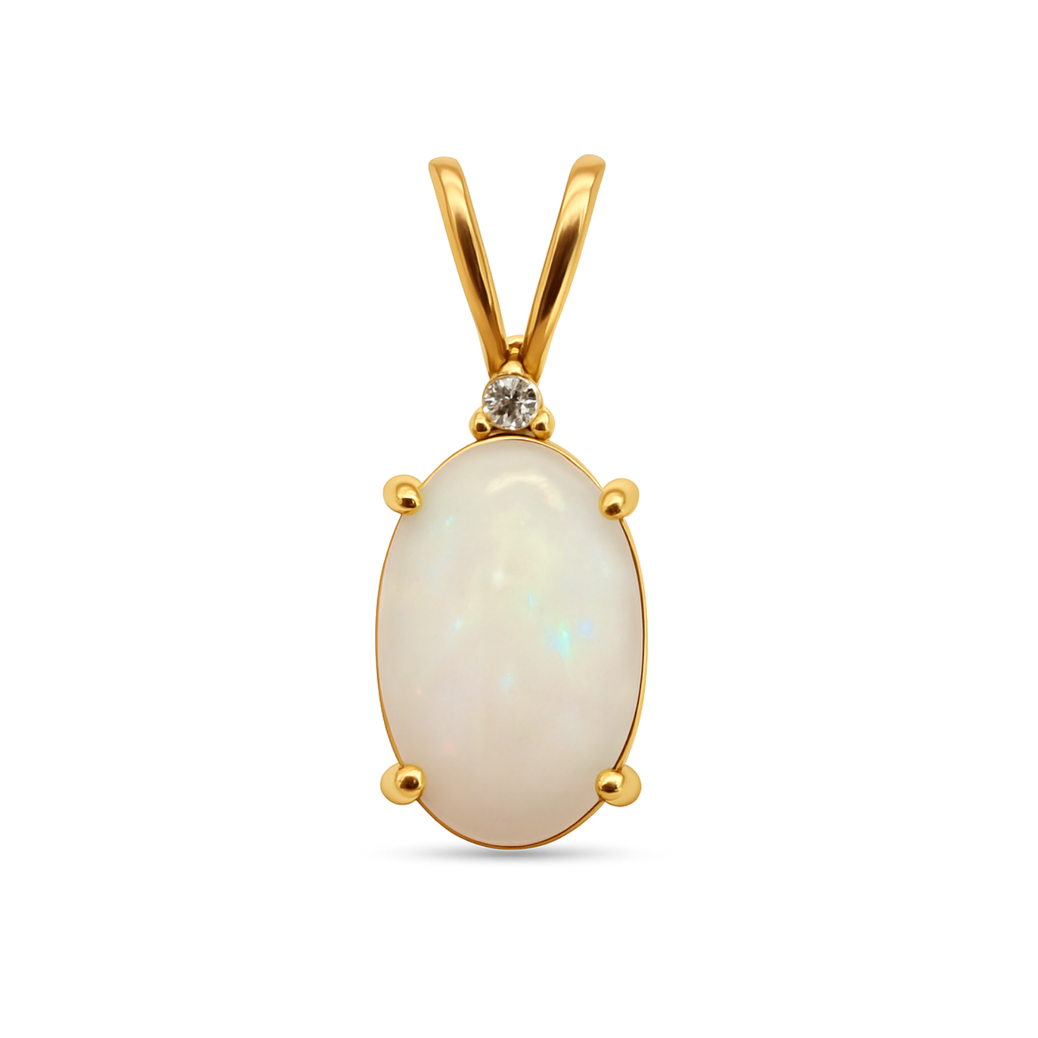This estate pendant is crafted in 14K yellow gold and features an oval cabochon white base opal secured in a four-prong setting. Above the opal rests a round brilliant cut diamond, adding a refined accent.Details