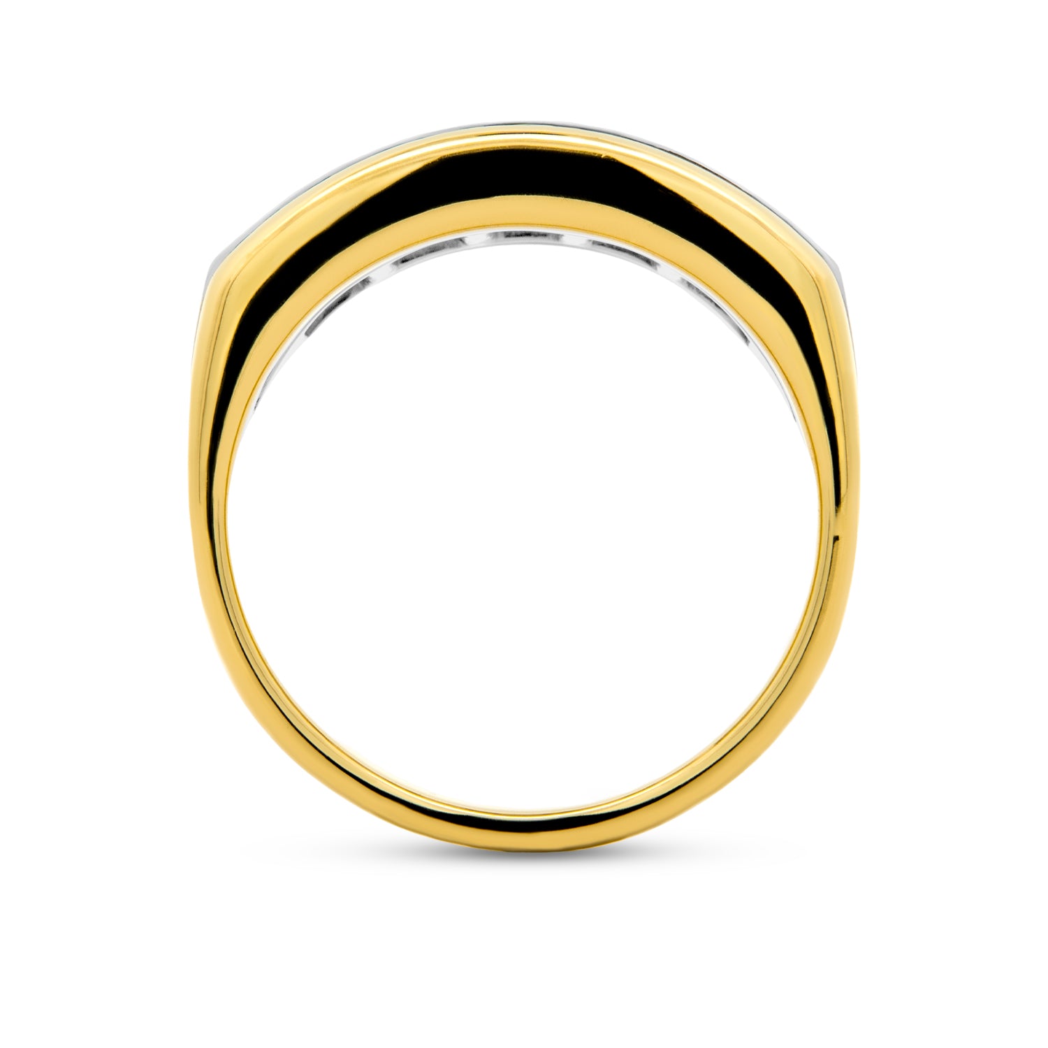 18 karat yellow gold and platinum Bensel Made men's five stone band channel set with five princess cut lab grown diamonds at 2.92 carat total weight with E - F color and VS1 - VS2 clarity.Details