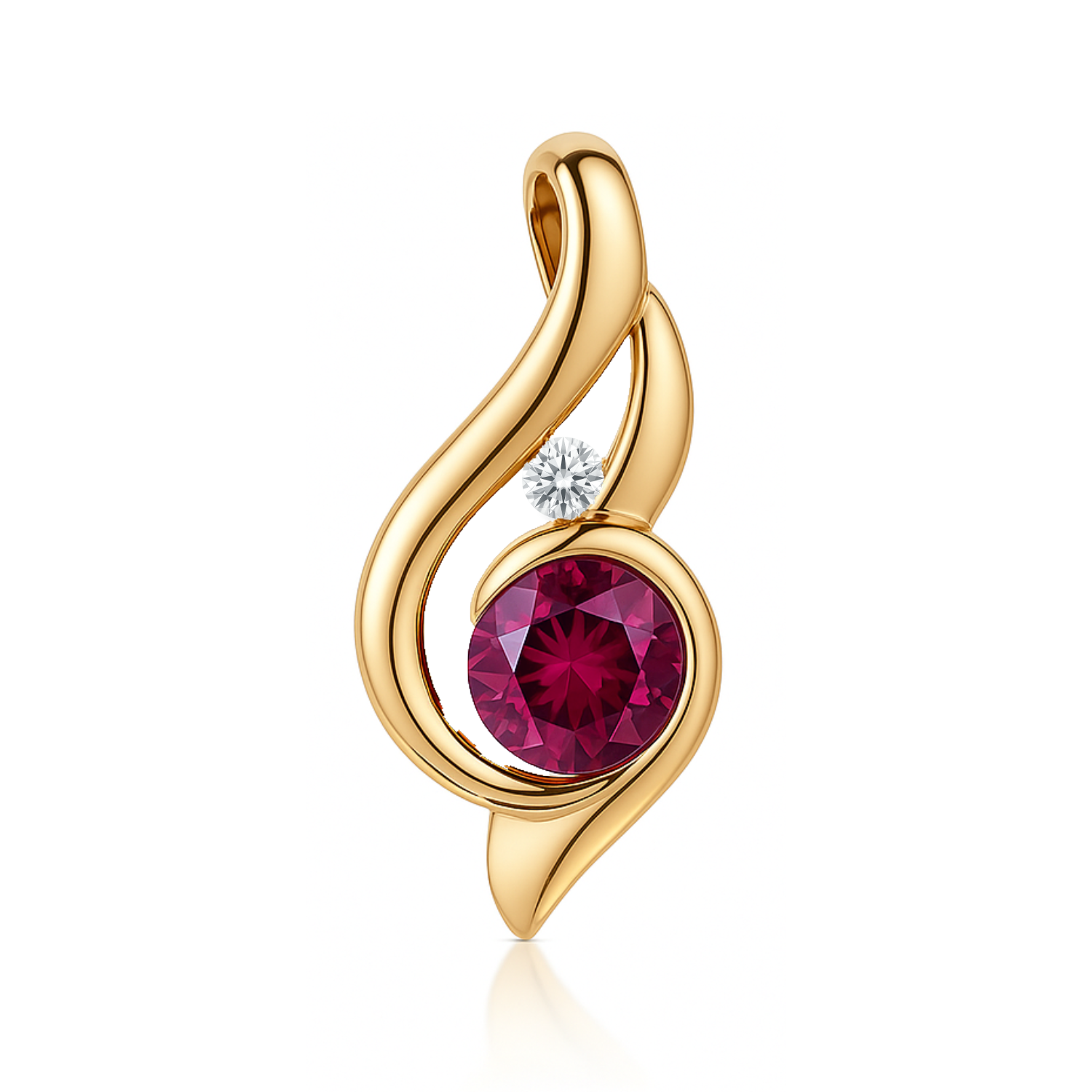 14 karat yellow gold freeform style pendant set with one 1.10 carat round rhodolite garnet, accented with one 0.06 carat round brilliant cut diamond with F - G color and VS1 - VS2 clarity.