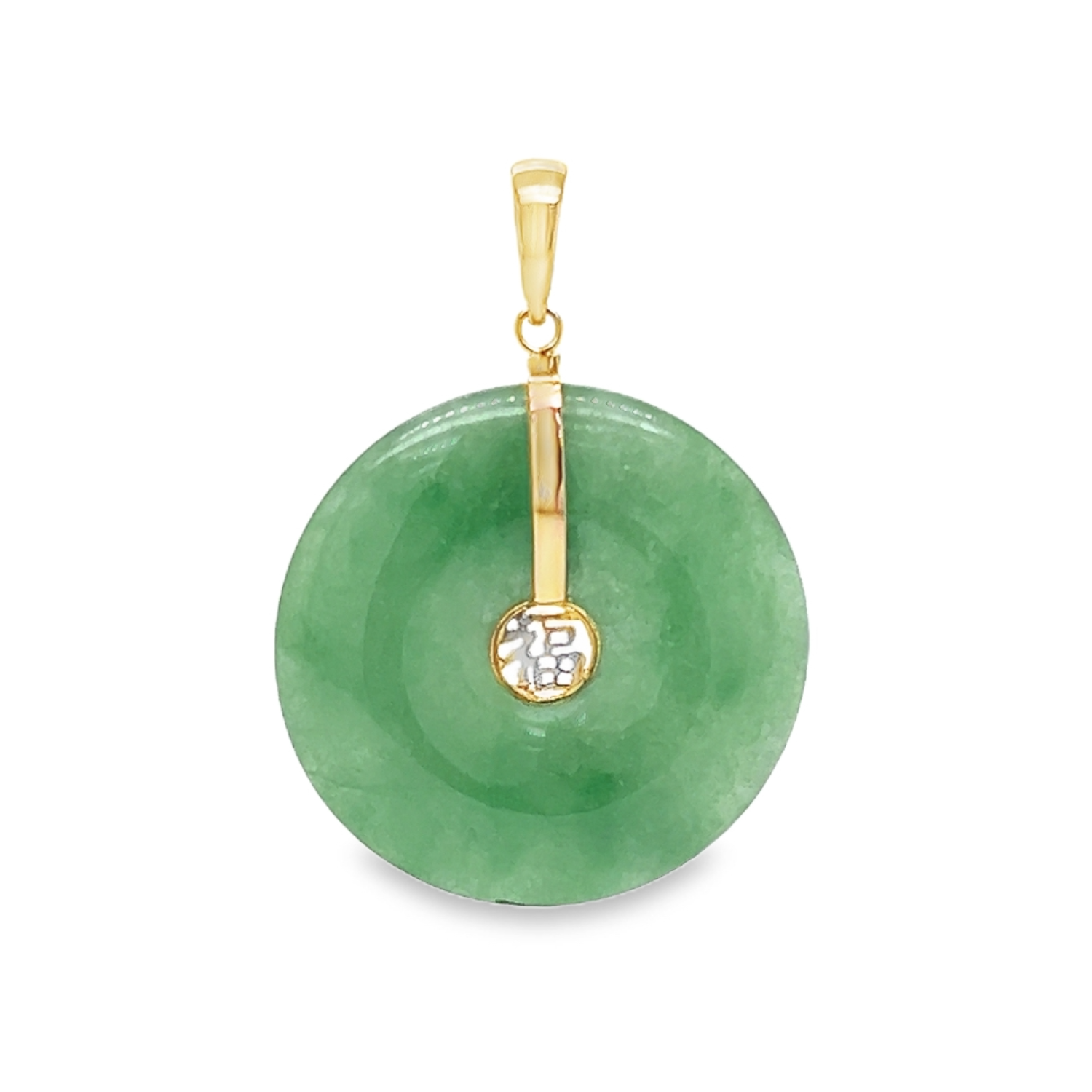 This exquisite estate 14K yellow gold jadeite disc pi pendant is a symbol of elegance and cultural significance. The pendant features a beautifully carved jadeite disc, also known as a Pi disc, renowned for its smooth, polished surface and deep green hue. Jadeite is highly valued for its beauty and is often associated with purity, protection, and good fortune. Whether worn as a daily accessory or for special occasions, this pendant adds a touch of sophistication and meaning to any jewelry collection.