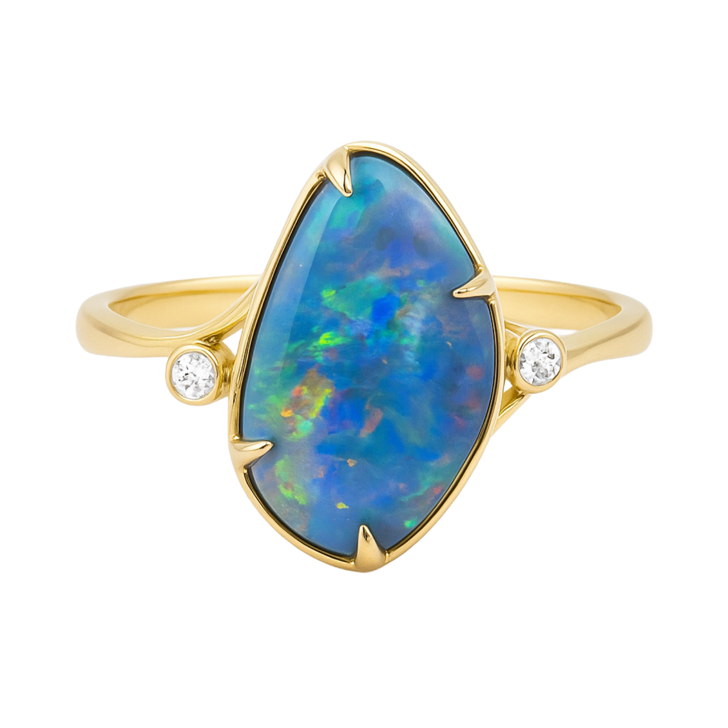 This 14K yellow gold ring features a freeform opal doublet, highlighted by two bezel-set round diamonds. Its vibrant play of color and modern asymmetry make it a striking addition to any jewelry collection.Details