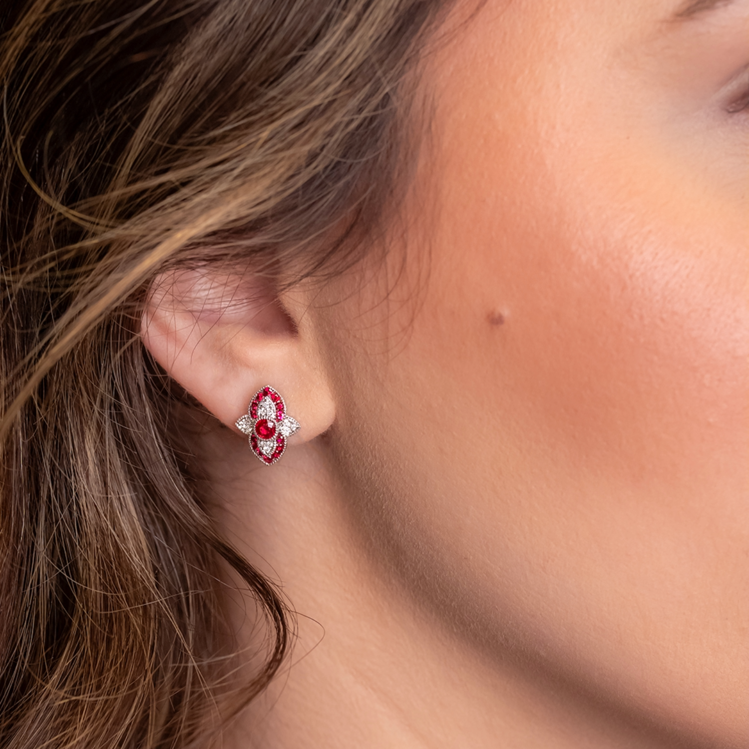 14 karat white gold j-hoop style earrings set with 30 round rubies at 0.78 carat total weight, accented with 24 round brilliant cut diamonds at 0.12 carat total weight with G color and SI1 clarity.Details