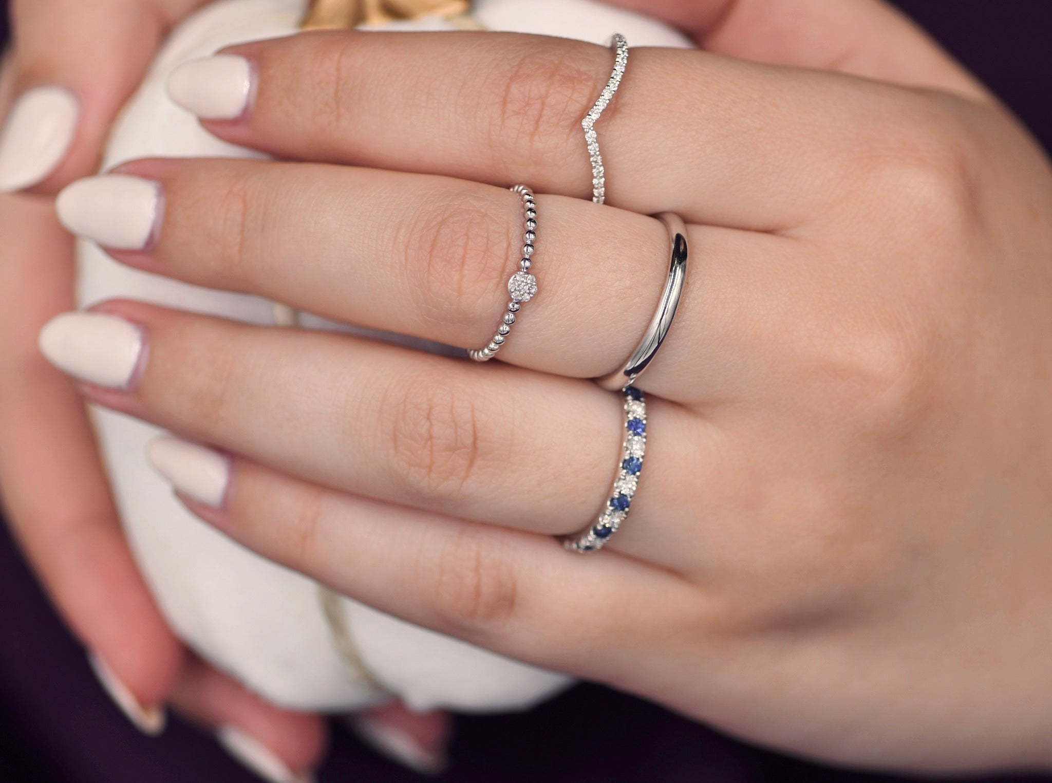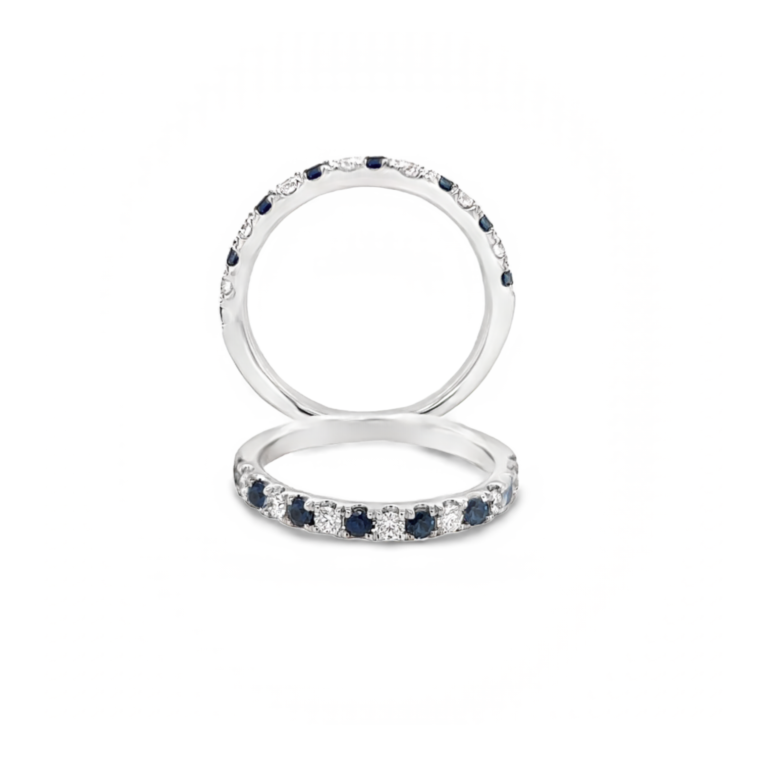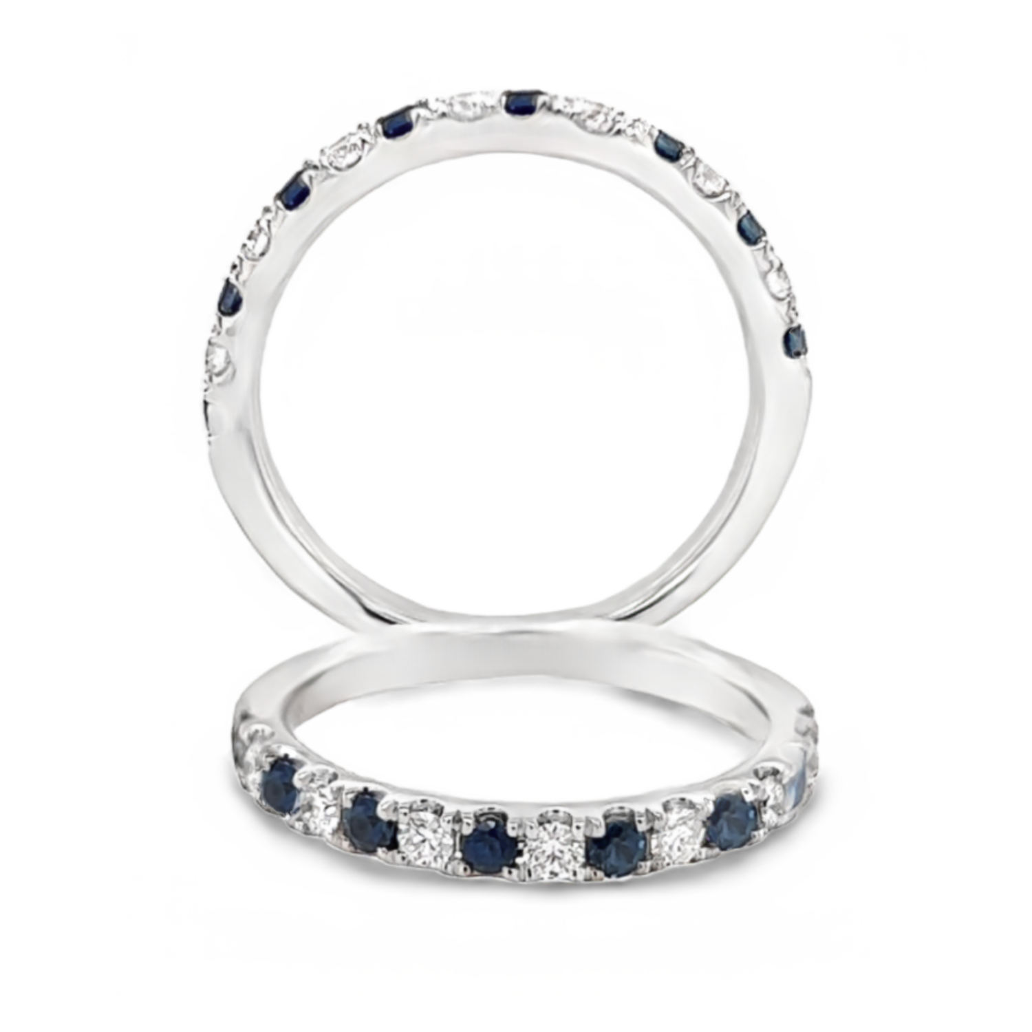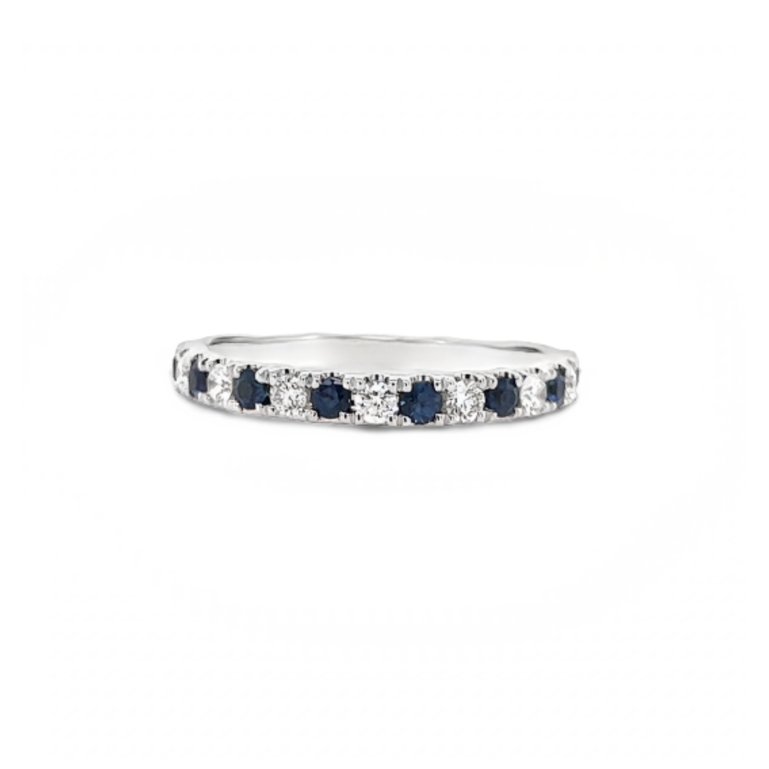 Immerse yourself in the rich allure of this 14K white gold diamond and sapphire band. An alternating pattern of sparkling diamonds and vibrant sapphires bestows an exquisite look, while the 14K white gold band provides a classic setting. Whether for an anniversary, a birthday, or just because, this elegant band captures a timeless elegance that enhances any attire.Details