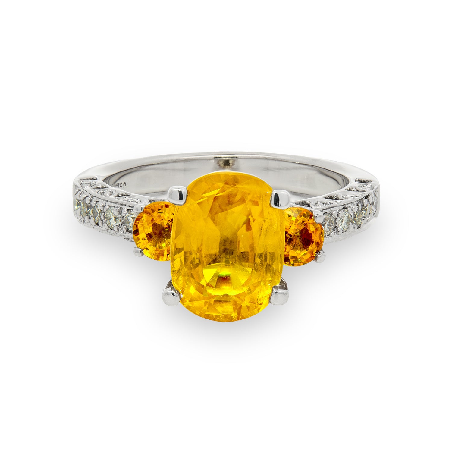 Crafted in 18k white gold, this estate three stone ring showcases an oval beryllium-diffused yellow sapphire framed by two round beryllium-diffused yellow sapphires. Round brilliant cut diamonds accent the shoulders, adding a refined touch to the vibrant center arrangement.Details
