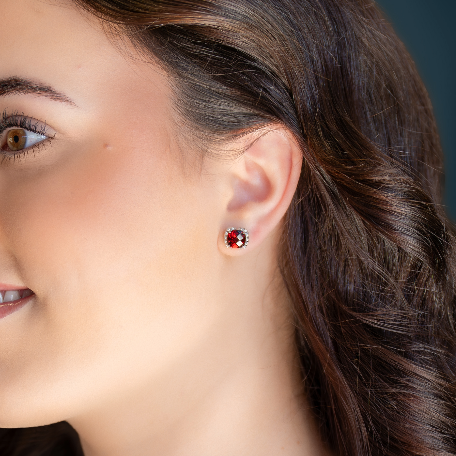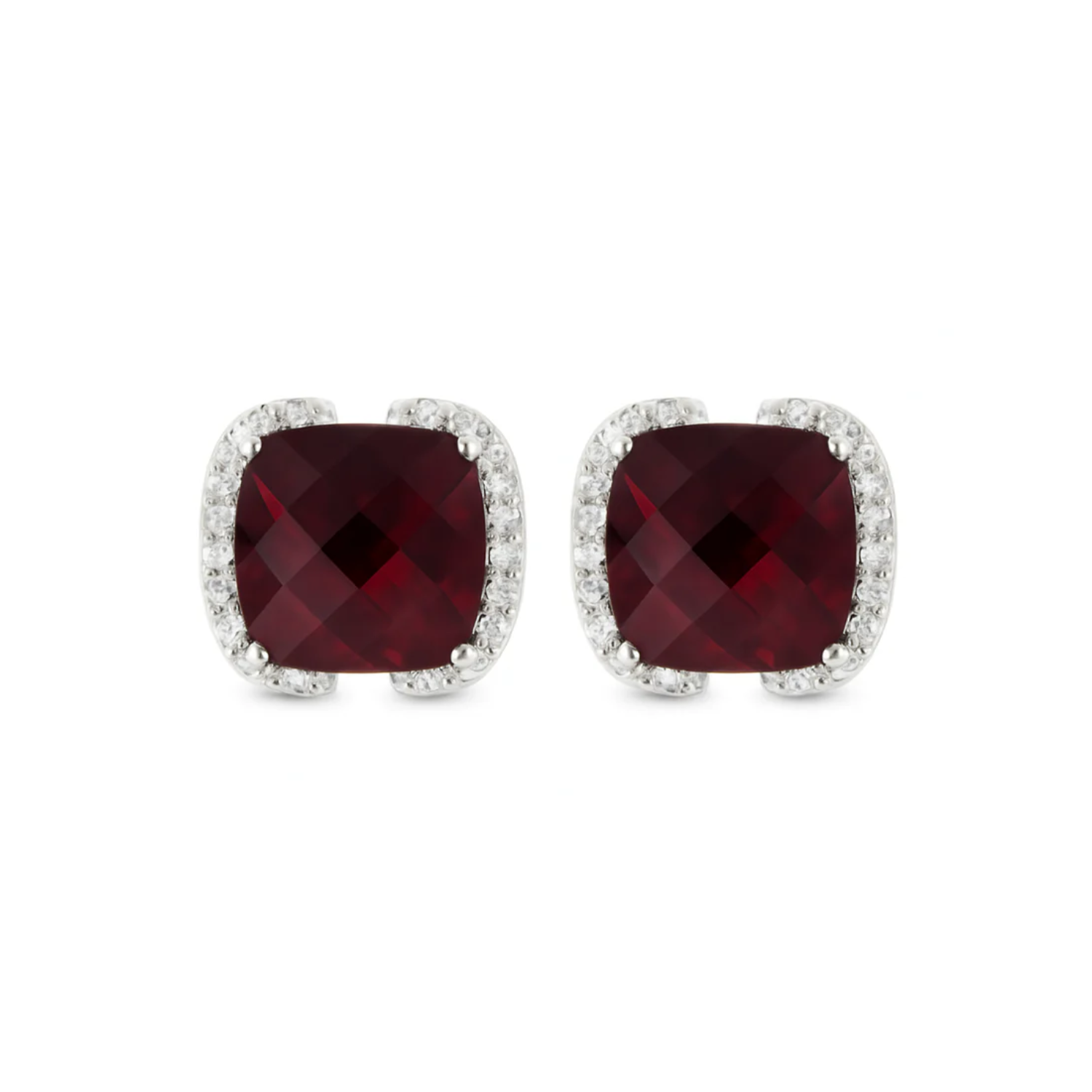 These striking 14K white gold earrings feature rich, cushion-shaped checkerboard-cut garnets that shimmer with deep red hues. Framed by a halo of sparkling diamonds, the combination of the garnet’s bold color and the brilliance of the diamonds creates an elegant and captivating look. Ideal for both day and evening wear, their timeless design ensures they will be cherished for years to come.