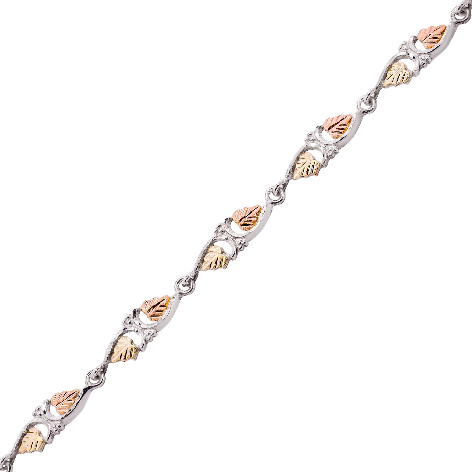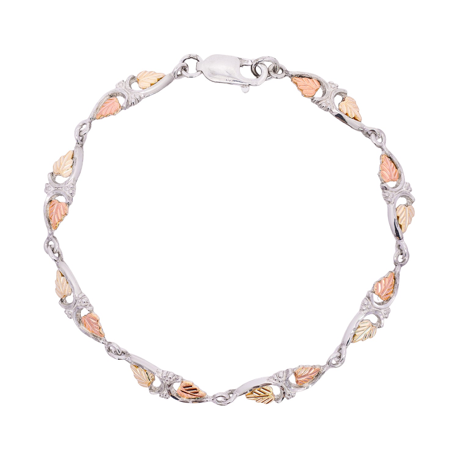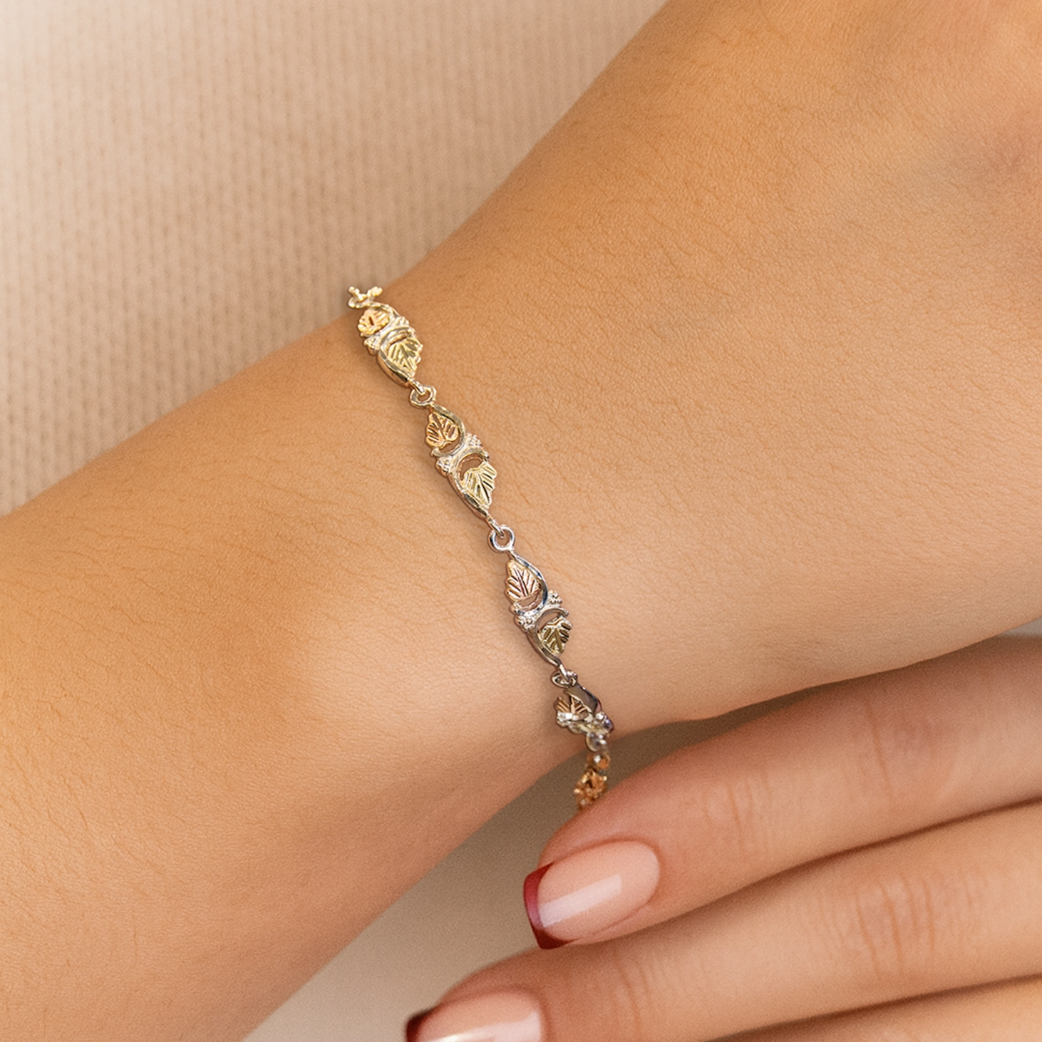 This bracelet is crafted in sterling silver and accented with 10K Black Hills Gold leaves in rose and yellow tones. It is equipped with a lobster claw style clasp for secure wear.Details