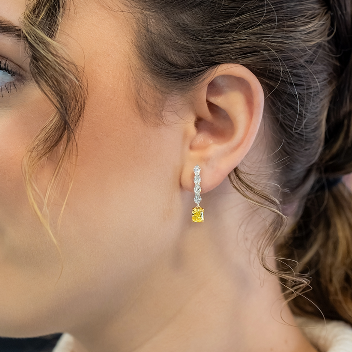 These 18K two-tone dangle earrings combine the brilliance of white gold with the warmth of yellow gold, creating a striking backdrop for their exceptional gemstones. Each earring features a vibrant fancy intense yellow radiant cut diamond that hangs gracefully at the base, with its rich color beautifully enhanced by the yellow gold setting. Above each radiant diamond are four oval diamonds arranged in an elegant vertical line, offering a bright, shimmering contrast against the white gold. Together, the combination of yellow diamonds and classic white diamonds creates a refined yet bold design that brings both color and brilliance to every movement.Details