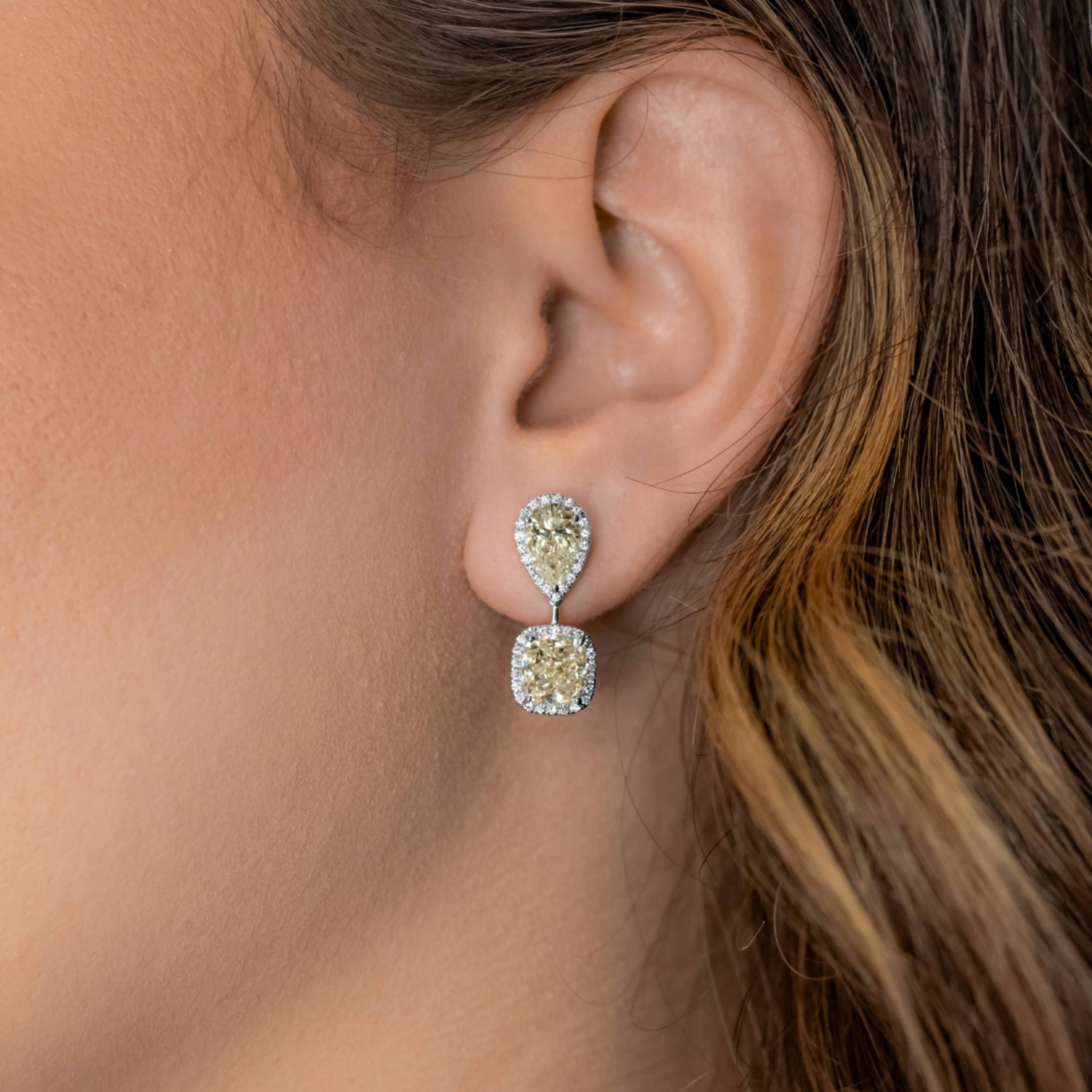 18 karat white gold two stone halo dangle earrings set with one 2.01 carat cushion cut diamond with S to T color and VS1 clarity (GIA Report #: 5231327564), one 2.01 carat cushion cut diamond with W to X color and VS1 clarity (GIA Report #: 2235327569), accented with two pear shaped diamonds at 2.10 carat total weight with P - Q - R color and SI1 - SI2 clarity, and 86 round brilliant cut diamonds at 0.43 carat total weight with L - M - N color and VS1 - SI1 clarity, equipped with friction style backs.Details