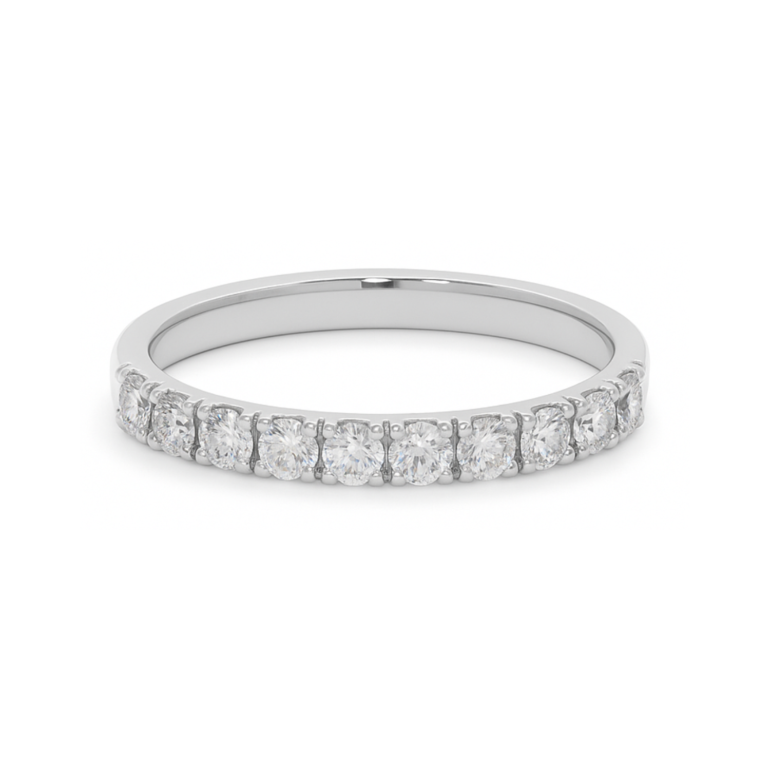 This 14K white gold band is set with a row of round brilliant cut diamonds in a French v-split prong setting, offering a refined and elegant look that's perfect on its own or paired with an engagement ring.Details