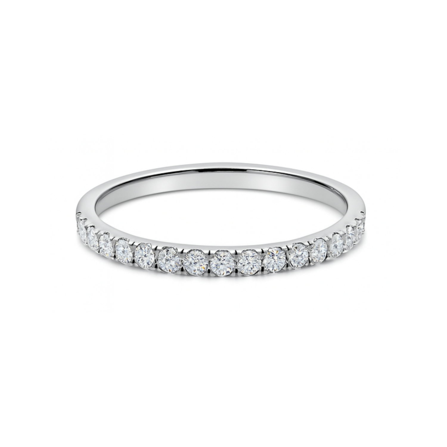 Crafted in 14K white gold, this classic band features a row of round brilliant cut diamonds set in a sleek, French v-split design. Perfect as a wedding band, anniversary ring, or stacking piece, it offers timeless sparkle for any occasion.Details