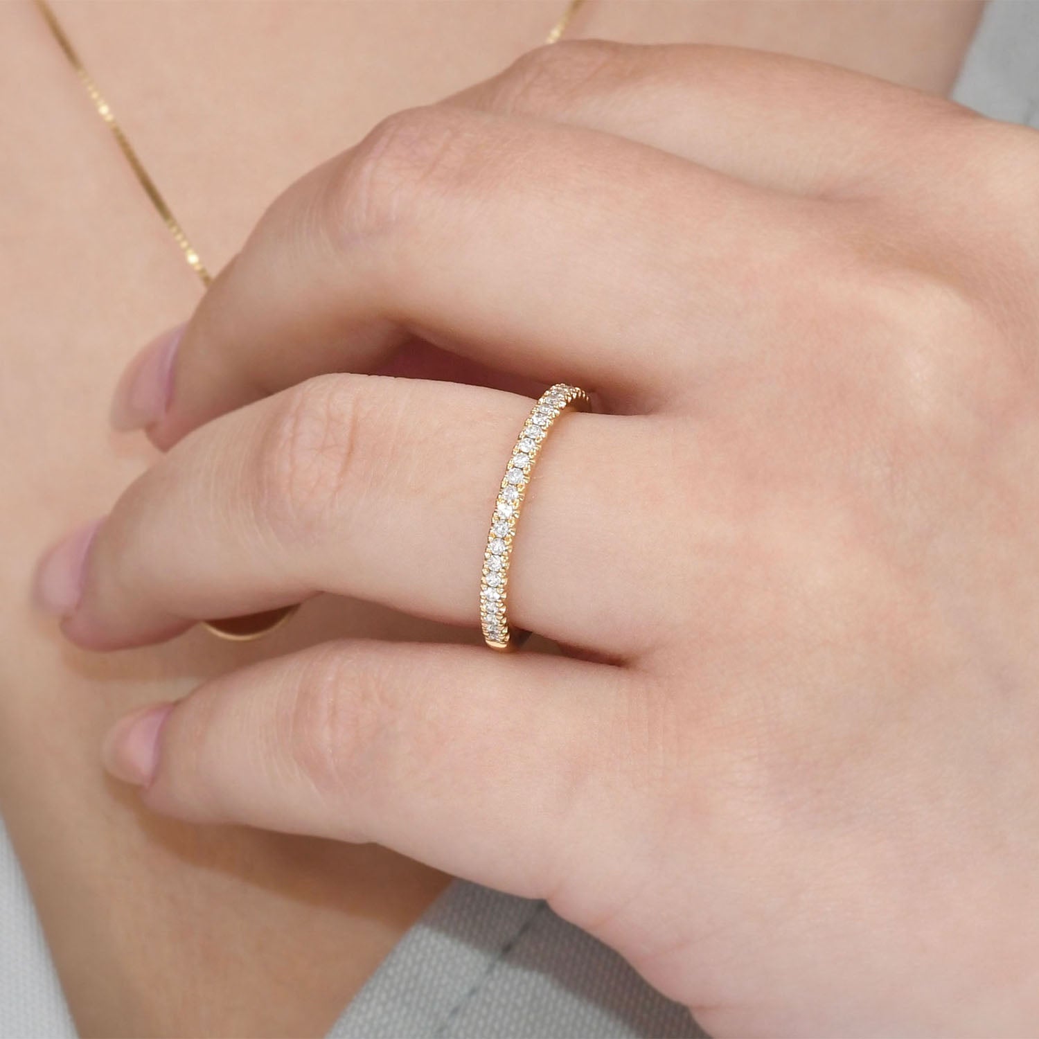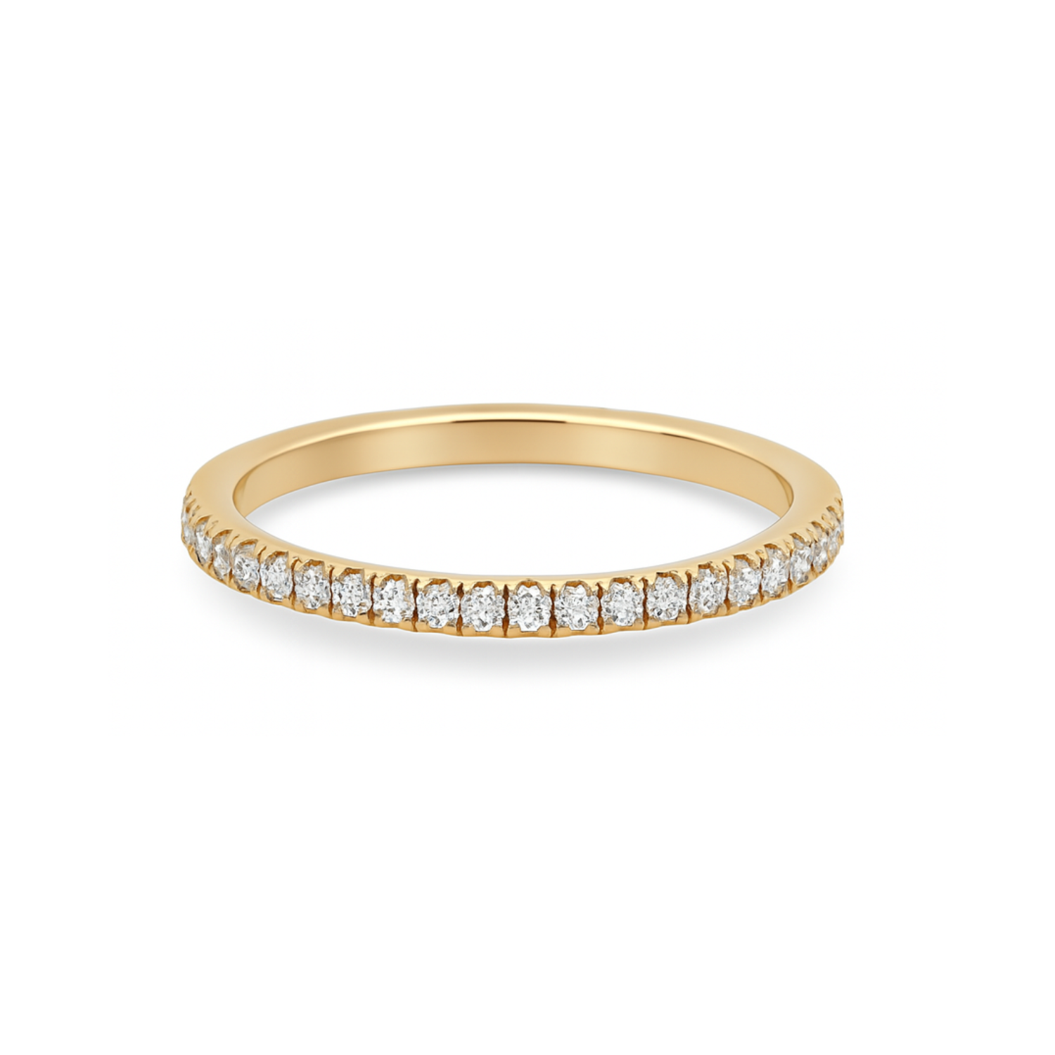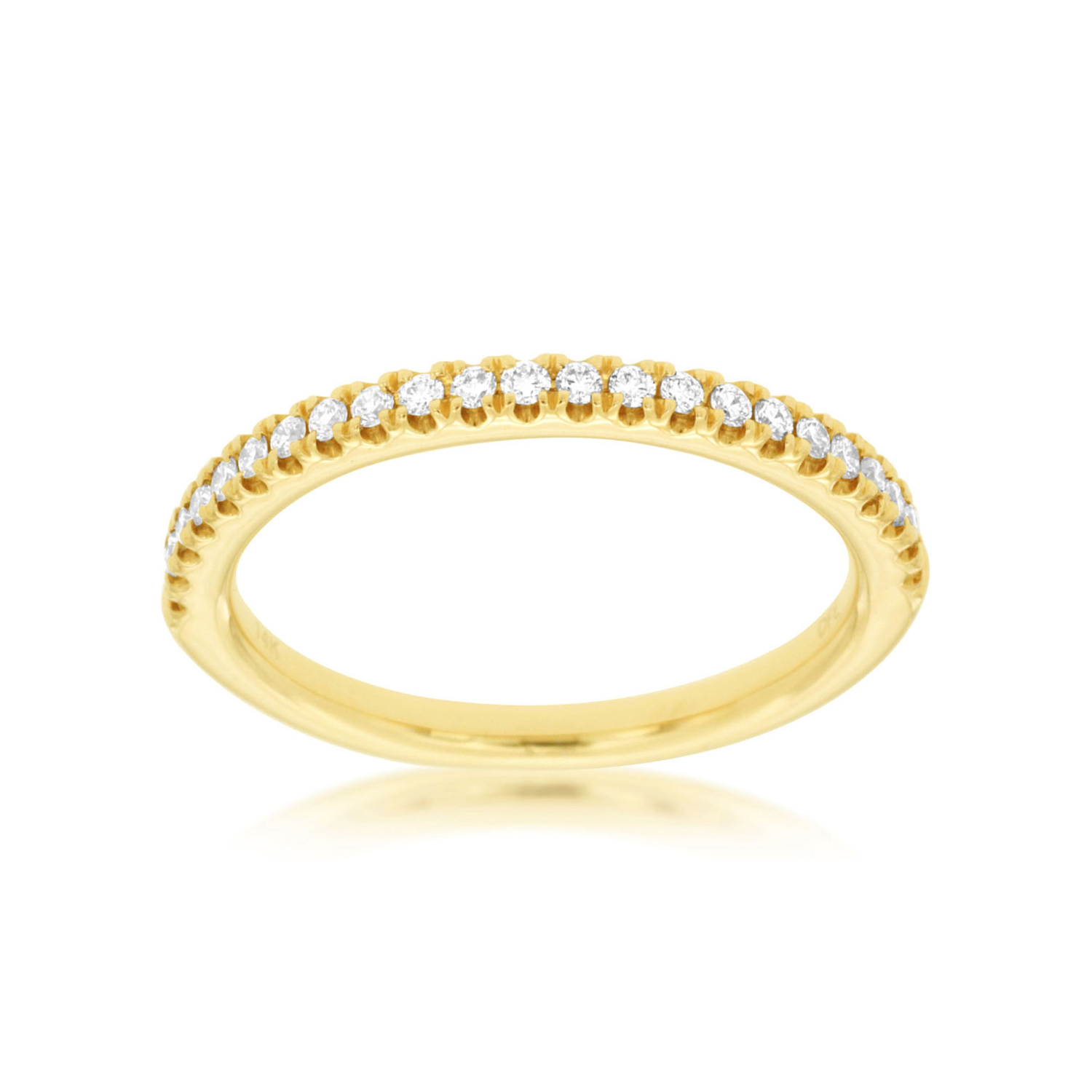 This elegant 14K yellow gold band is set with round brilliant cut diamonds. The sparkling diamonds are set within the luminous gold, providing a classic yet chic look. This band serves as an exquisite symbol of love, making it perfect for an anniversary gift, wedding band, or just to add some sparkle to your everyday style.Details