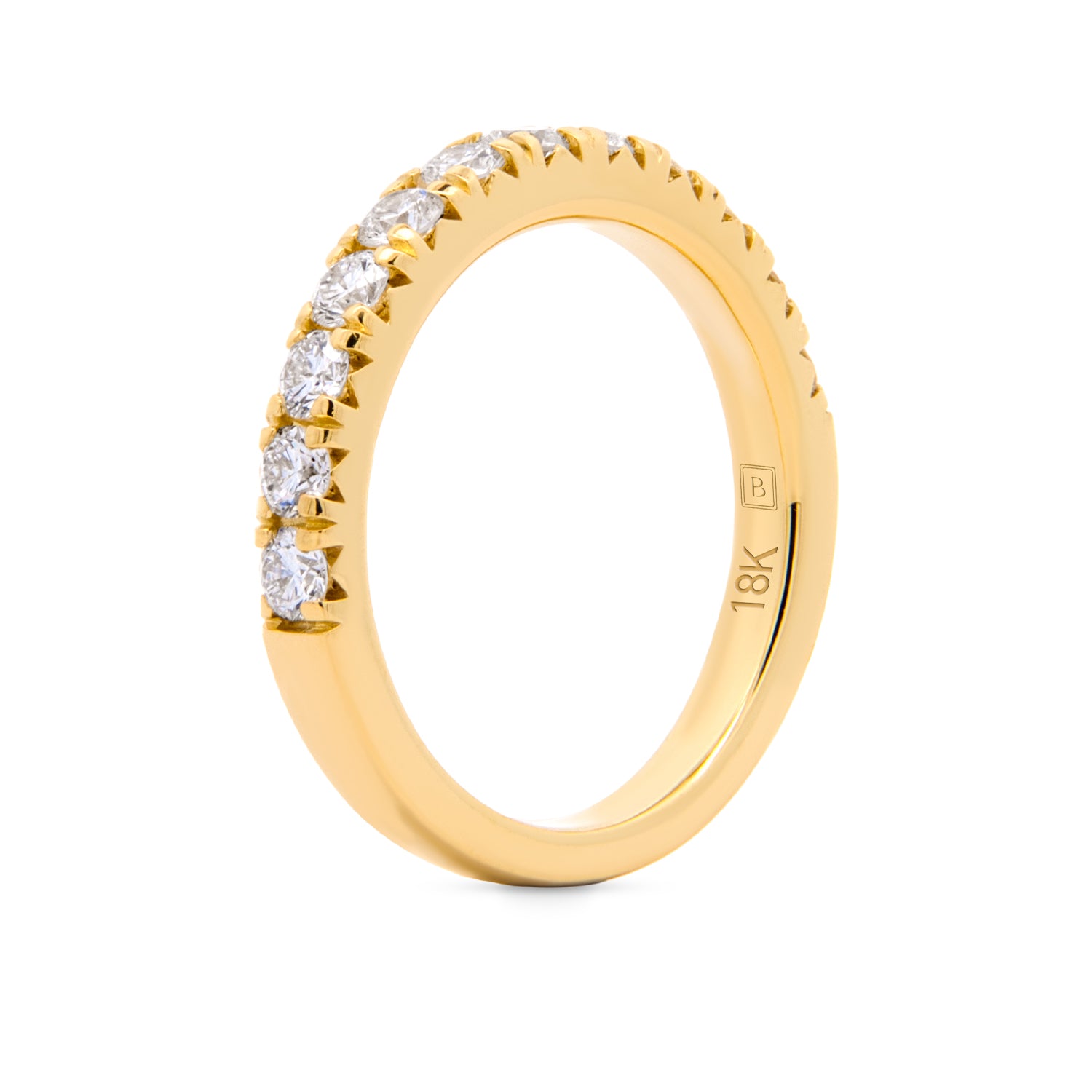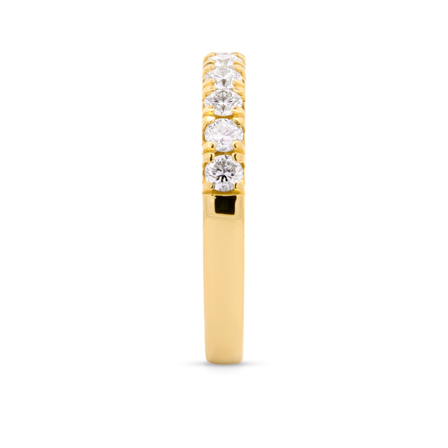 18 karat yellow gold Bensel Made french set band set with 12 round brilliant cut lab grown diamonds at 0.85 carat total weight with E - F color and VS1 - VS2 clarity.