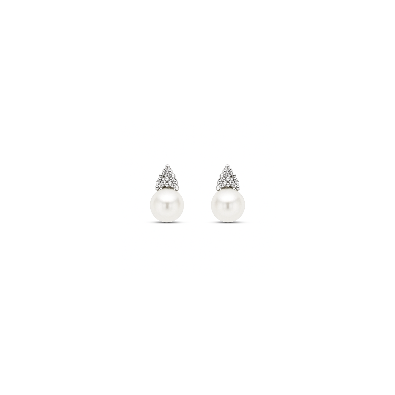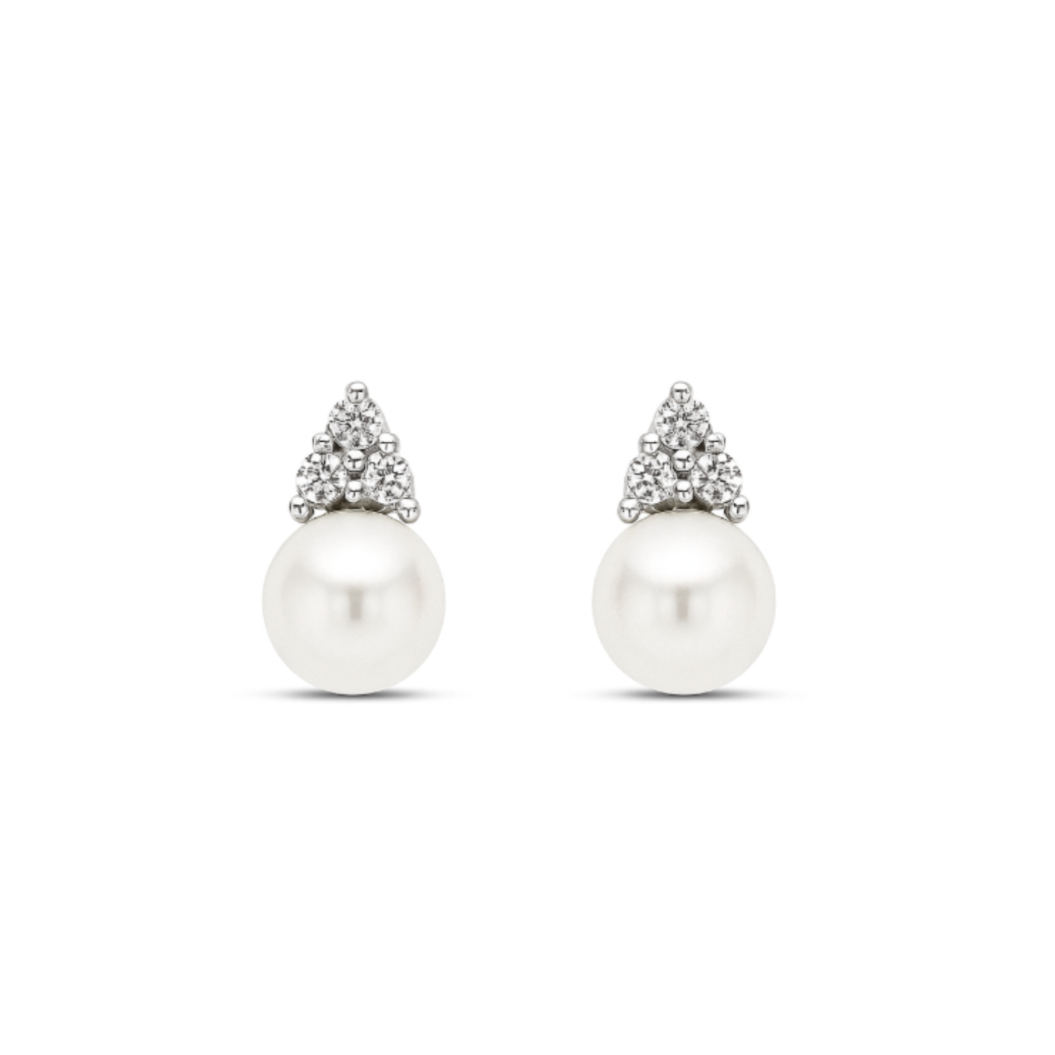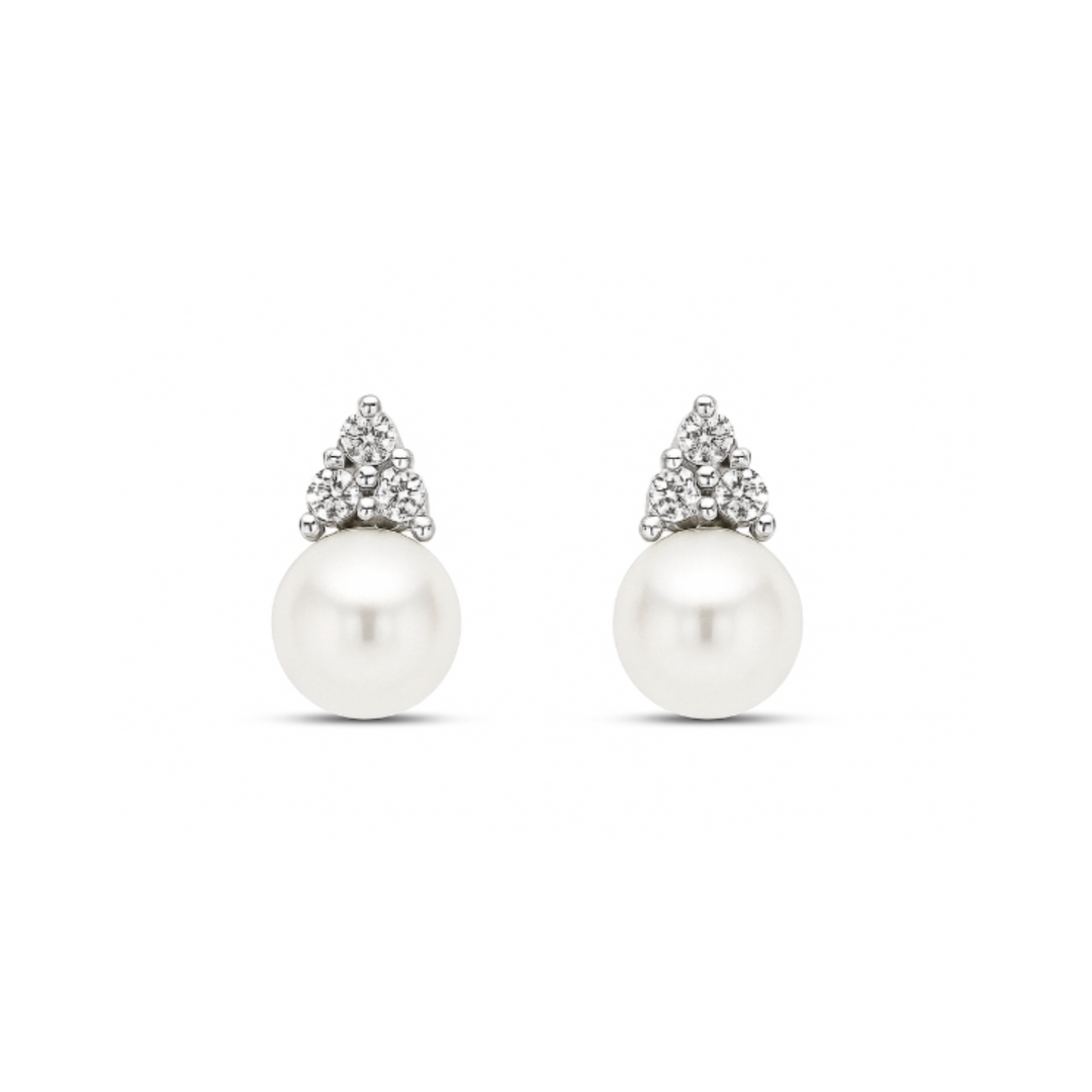 A timeless blend of elegance and sophistication, these 10K white gold earrings showcase lustrous cultured freshwater pearls. Each pearl is beautifully accented by a trio of sparkling diamonds, adding a touch of brilliance to the classic design. Perfect for any occasion, these earrings are a refined choice for those who appreciate graceful beauty.Details