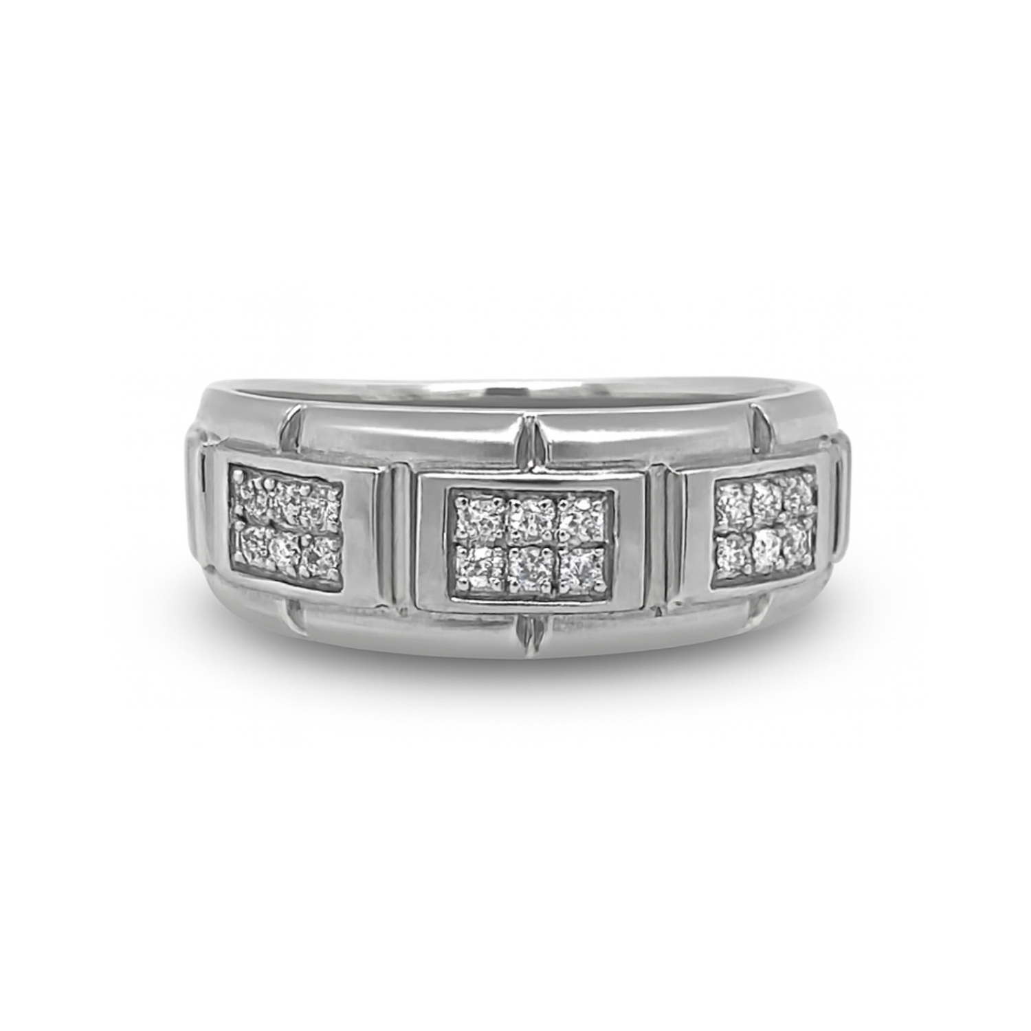Crafted in 10K white gold, this men’s band features a bold design with three rectangular panels set with round brilliant cut diamonds. The structured styling and diamond accents create a strong and sophisticated look.Details
