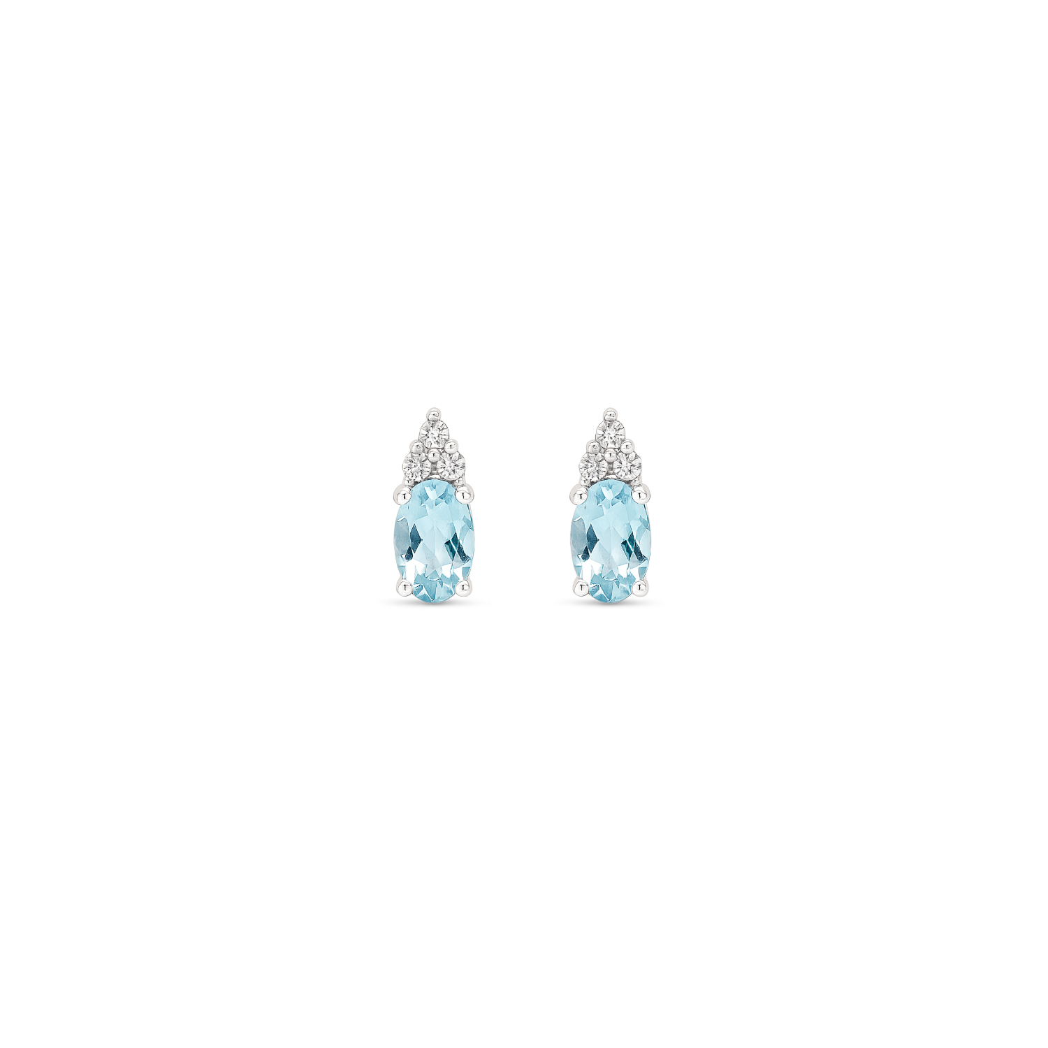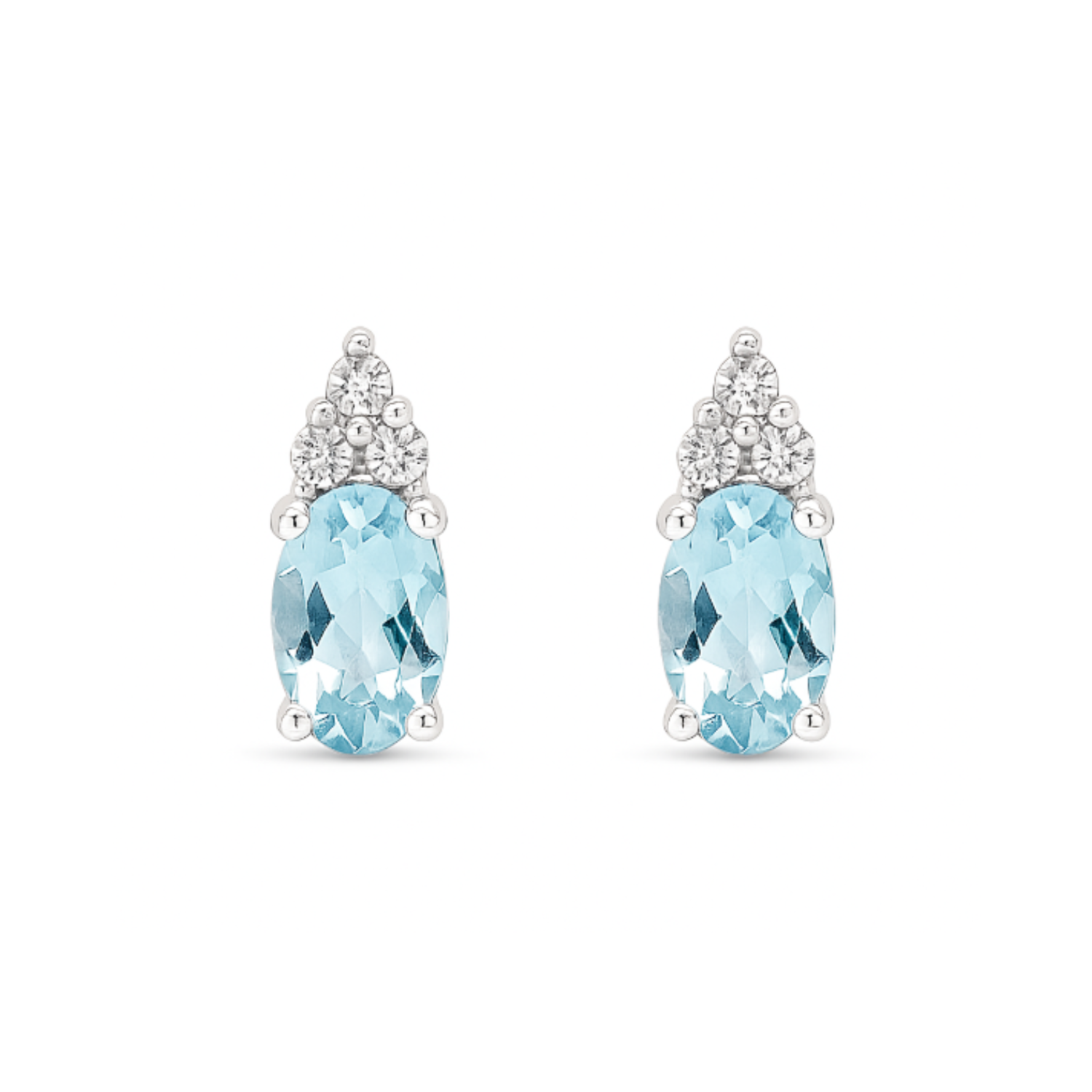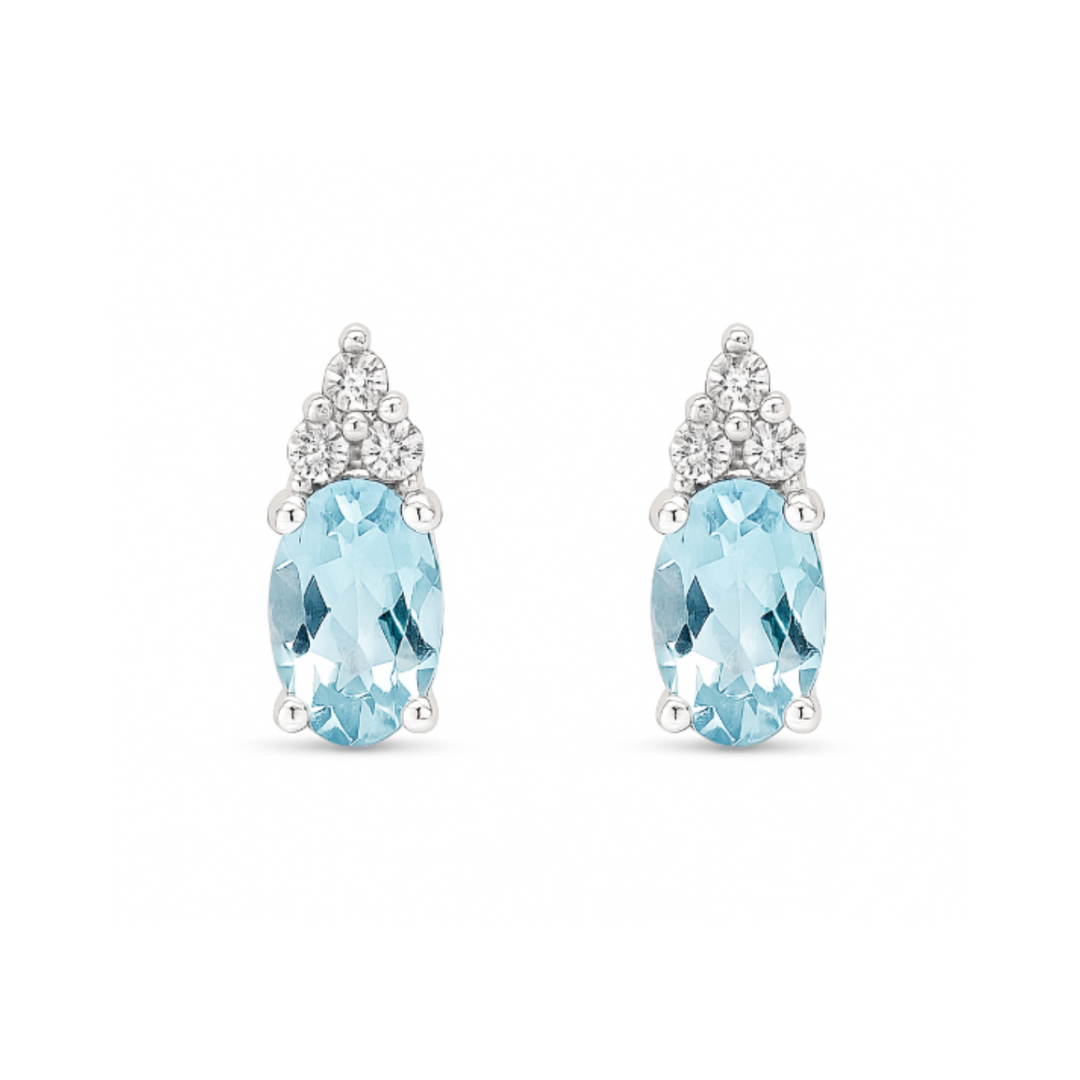Crafted in 10K white gold, these elegant earrings showcase vibrant oval aquamarines with a captivating soft blue hue. The aquamarines are beautifully accented by a trio of shimmering diamonds arranged above each gemstone, adding brilliance and sophistication. Perfect for any occasion, these earrings are a timeless addition to your jewelry collection.Details