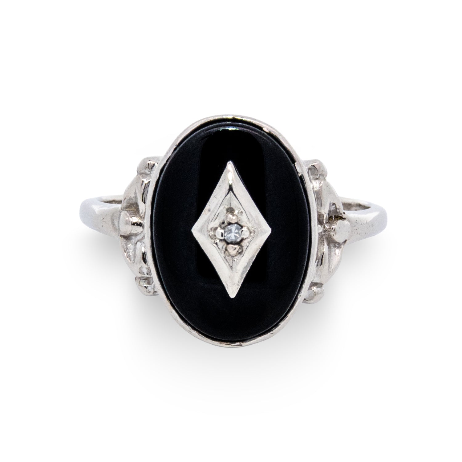 10 karat white gold estate fashion ring set with one 14 x 10 mm flat oval cabochon onyx, accented with one round single cut diamond at 0.01 carat with I - J color and I1 clarity.Details