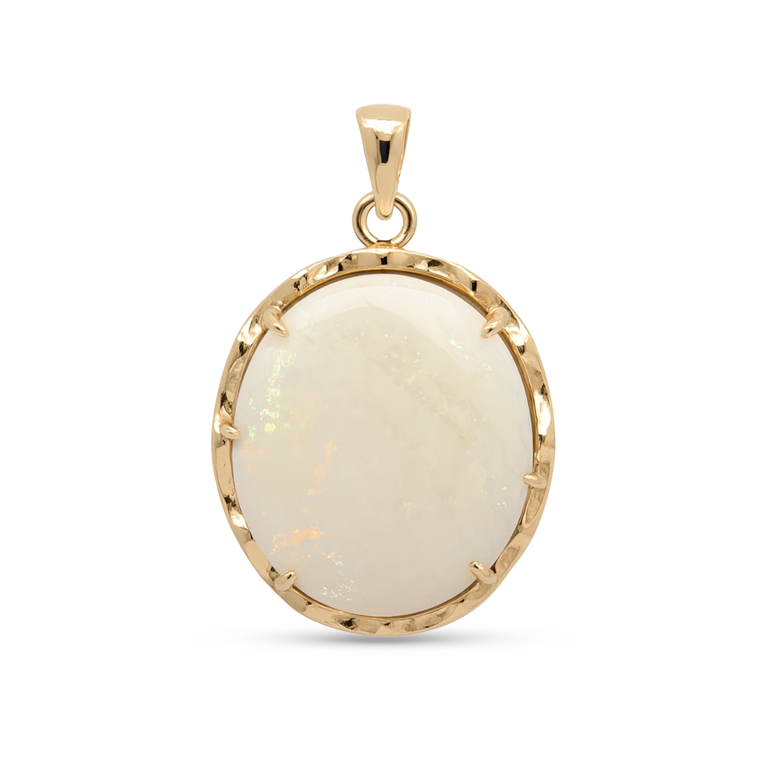 This 10K yellow gold estate pendant showcases an oval cabochon white base opal held in a secure prong setting. The stone’s subtle play of color and the textured gold frame create a soft, vintage charm.Details