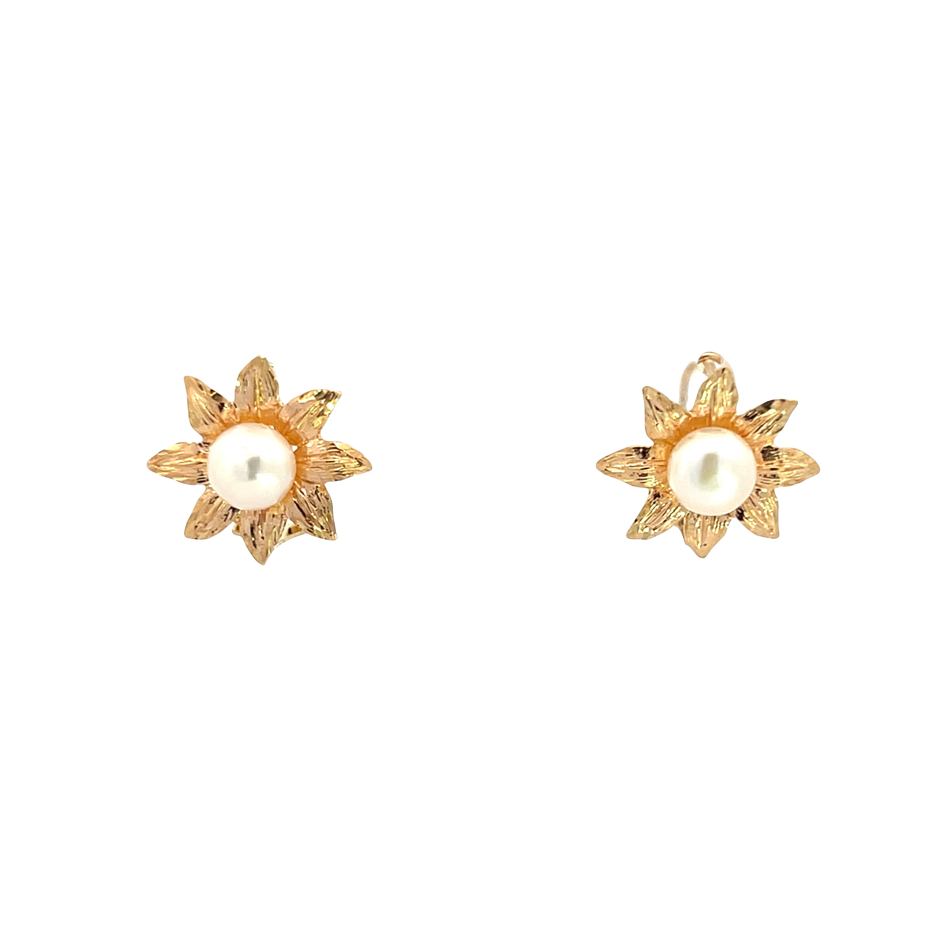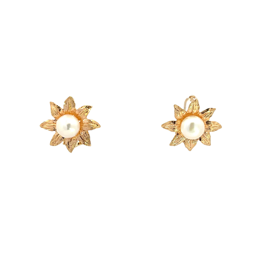 These estate 10K yellow gold earrings feature delicate floral motifs with textured petal detailing surrounding cultured freshwater button pearls at the center. The dimensional flower design creates beautiful contrast between the lustrous pearls and the intricate gold work. These earrings are a charming garden-inspired design that brings natural beauty and feminine grace to everyday styling.Details