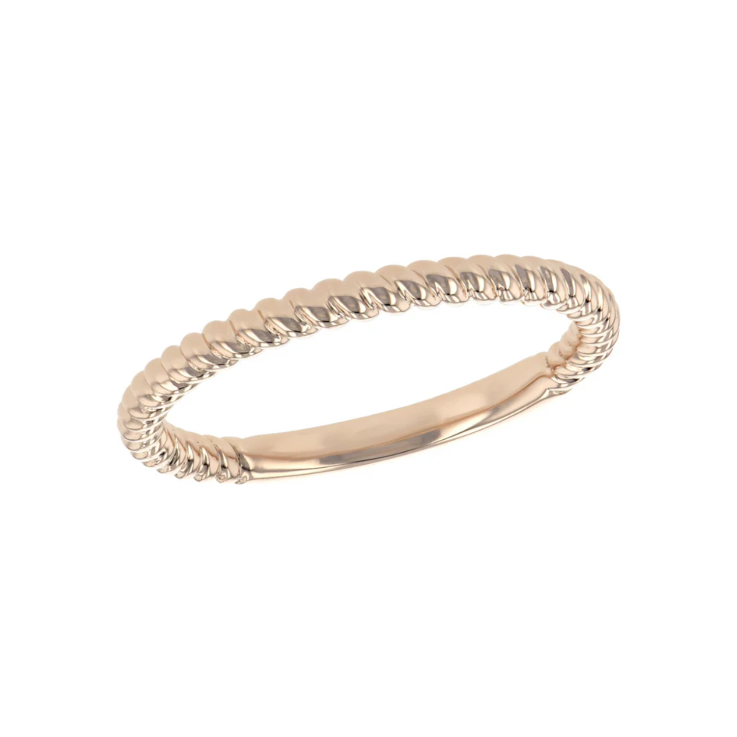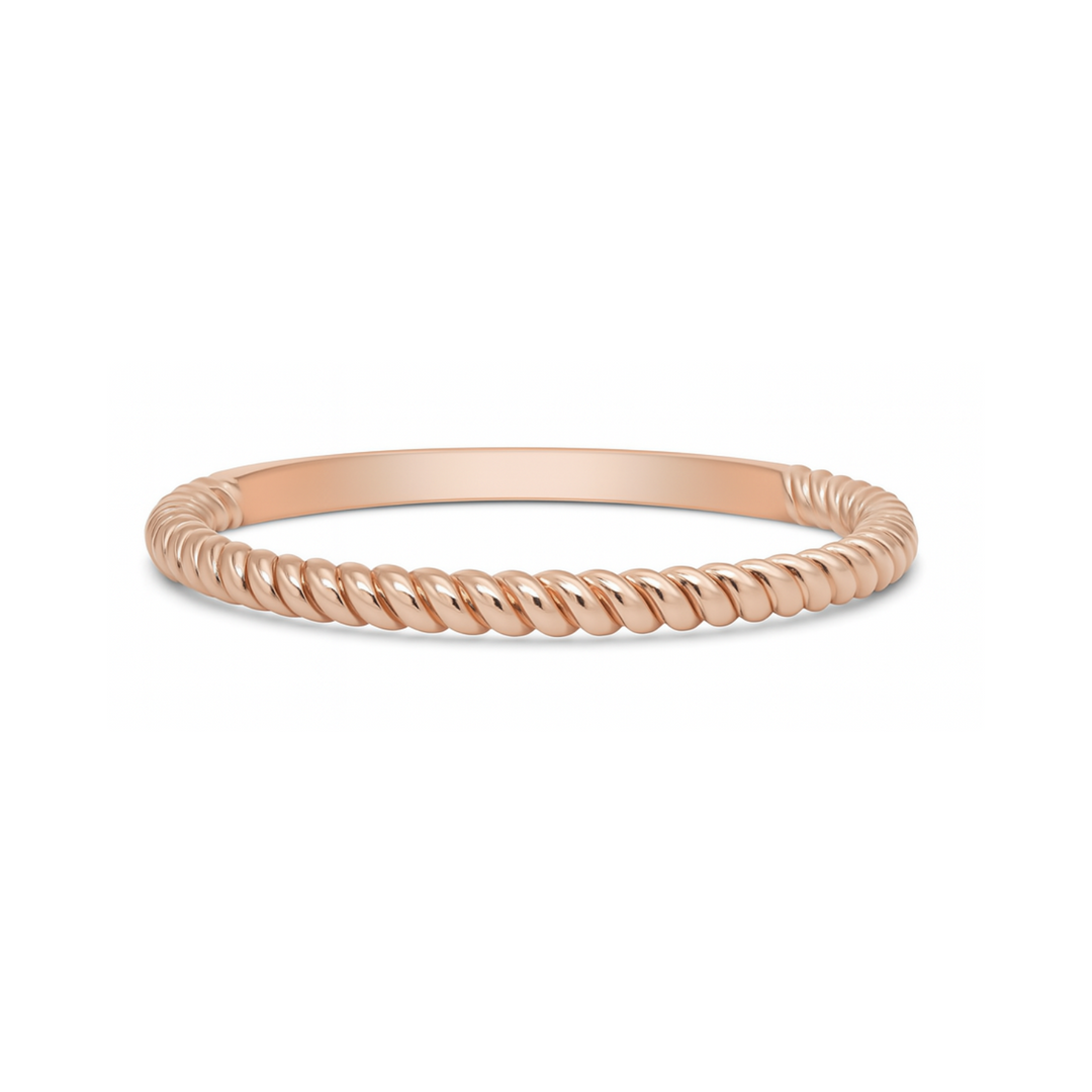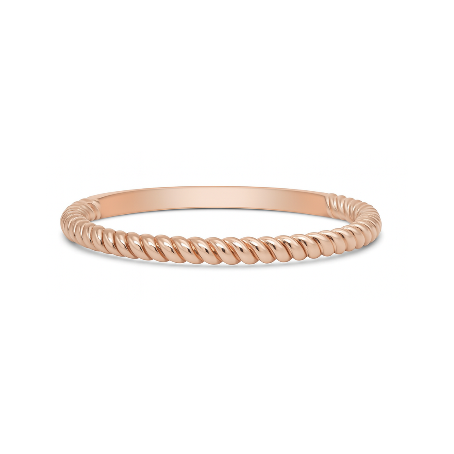 This 14K rose gold ring showcases a timeless twisted rope design, offering a sophisticated blend of texture and shine. The warm rose gold hue enhances its versatility, making it perfect for stacking or wearing alone. A subtle yet elegant piece, it adds a touch of refinement to any jewelry collection.Details