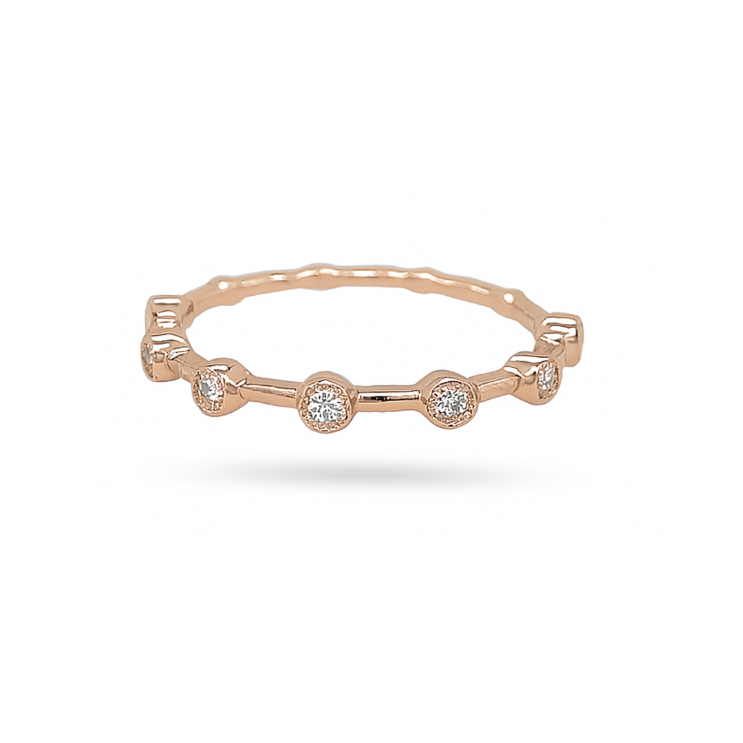 Delicate and stylish, this 14K rose gold stackable band is adorned with sparkling diamonds, each set in a bezel-inspired design. The unique textured band adds a touch of character, making it a perfect choice for layering or wearing as a standalone piece.Details